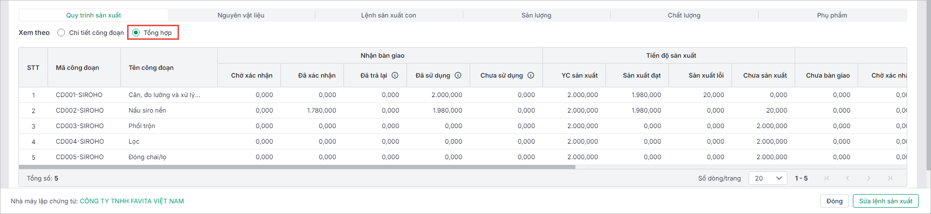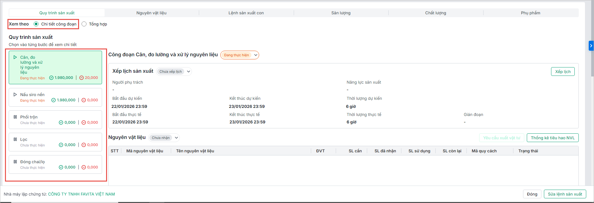 Tại tab “Quy trình sản xuất“, chọn Xem theo Chi tiết công đoạn hoặc Xem theo Tổng hợp.