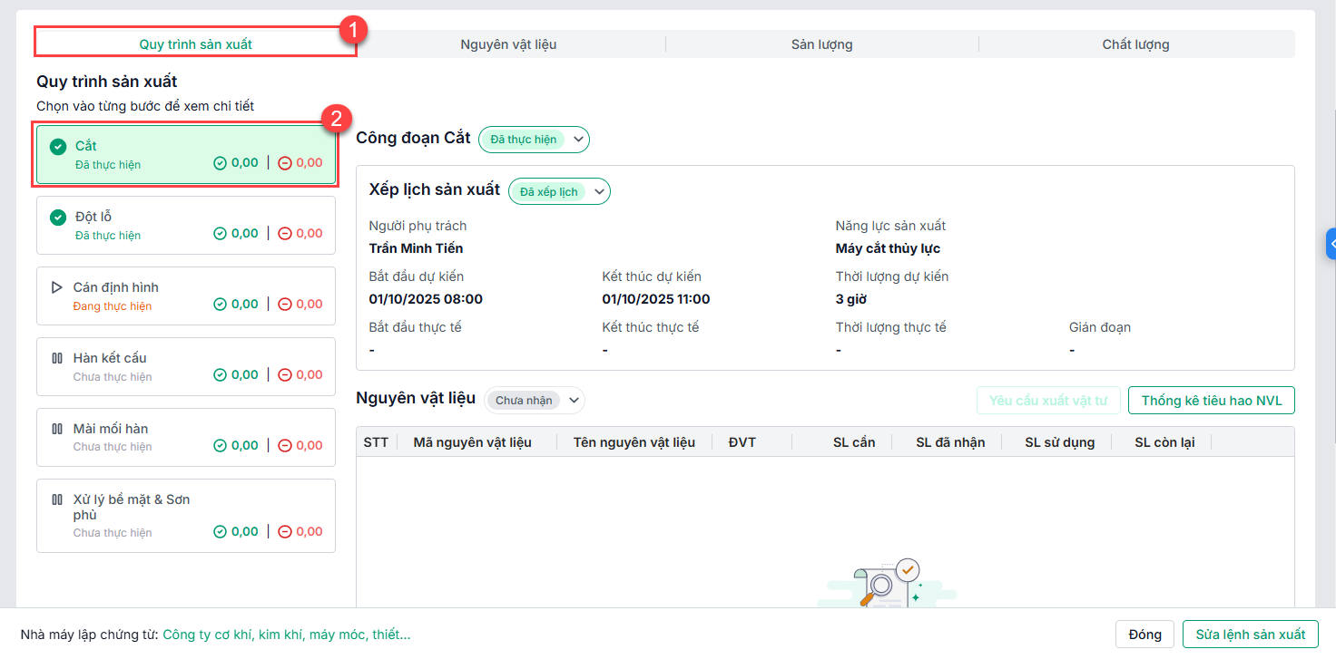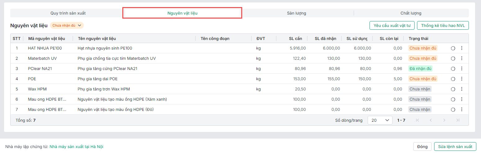 Chọn tab “Nguyên vật liệu” để theo dõi chi tiết tình hình cung ứng và sử dụng vật tư cho lệnh sản xuất.