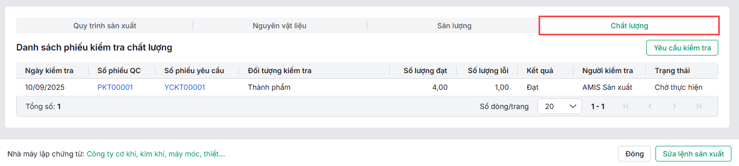Chọn tab “Chất lượng” chương trình hiển thị tất cả các phiếu kiểm tra chất lượng của lệnh sản xuất với các thông tin như Ngày kiểm tra, Đối tượng kiểm tra, Số lượng đạt / Số lượng lỗi, Kết quả, Người kiểm tra.