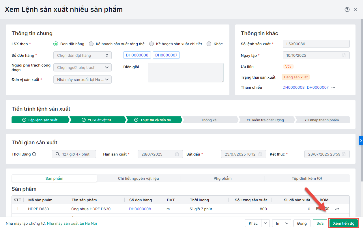 - Trên giao diện chi tiết Lệnh sản xuất nhiều sản phẩm, anh/chị nhấn Xem tiến độ.