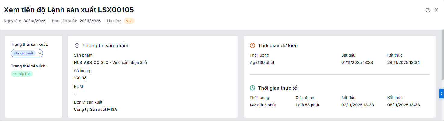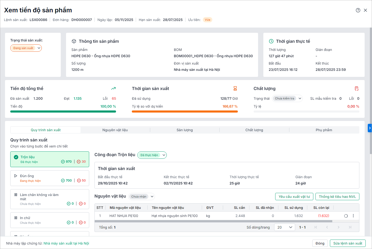 Anh/chị có thể xem chi tiết tiến độ thực hiện lệnh sản xuất như sau: