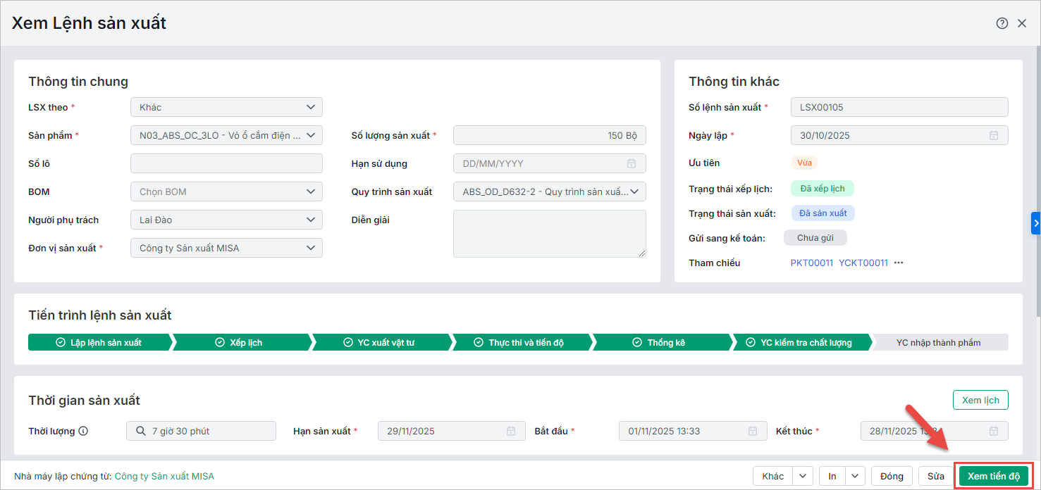 1. Trên giao diện chi tiết Lệnh sản xuất, anh/chị nhấn Xem tiến độ.