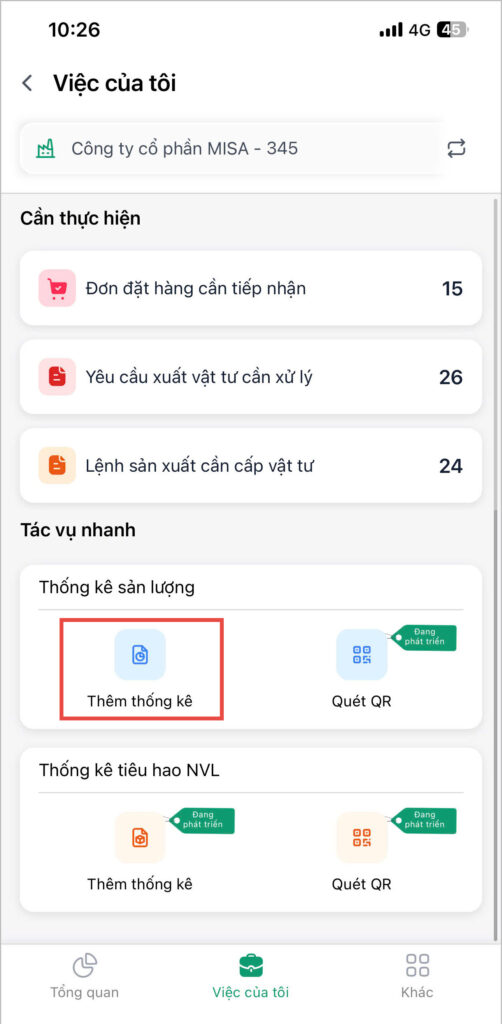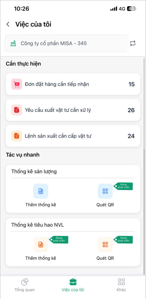 Bài viết hướng dẫn người dùng xử lý các đầu mục công việc trong mục Việc của tôi trên AMIS Sản xuất mobile.