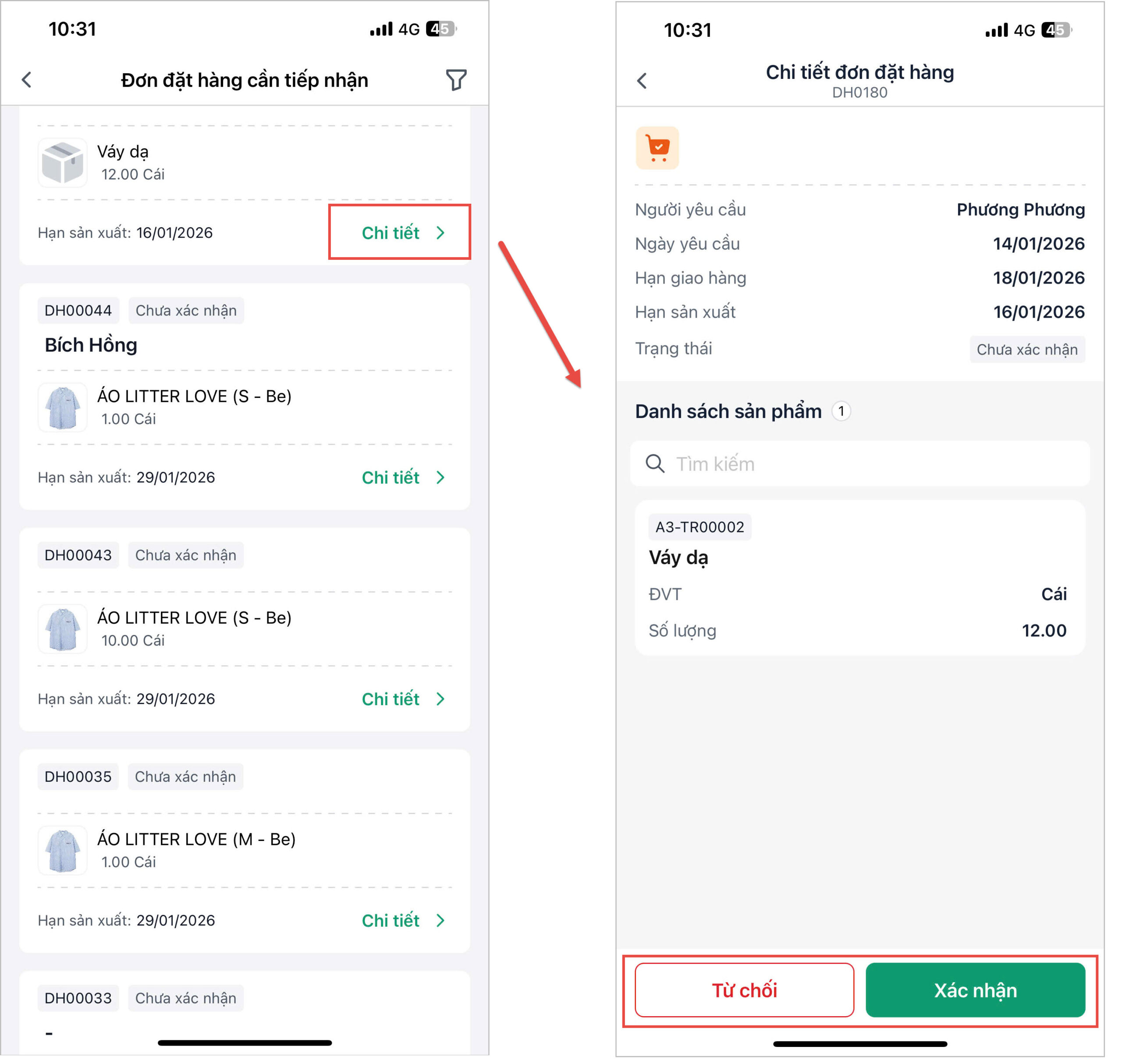 Mục Việc của tôi hiển thị danh sách các công việc ở tất cả các khoảng thời gian ở nhà máy đang chọn làm việc và tác vụ thực hiện nhanh trên mobile, bao gồm: