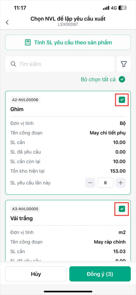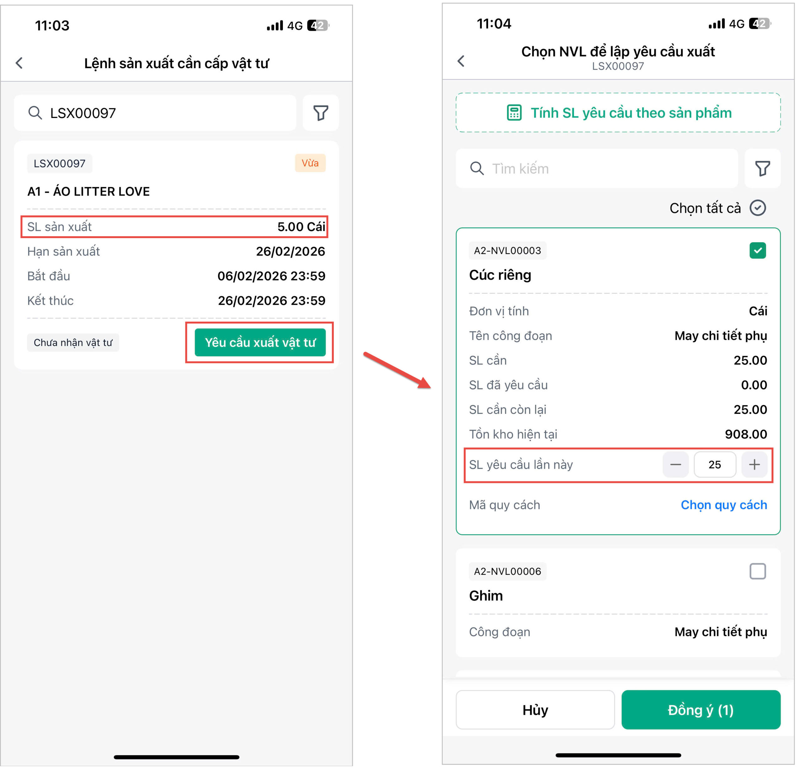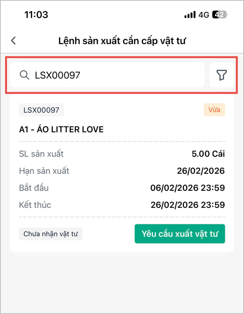 2.1.3. Lệnh sản xuất cần cấp vật tưMục Lệnh sản xuất cần cấp vật tư hiển thị danh sách các lệnh sản xuất có trạng thái yêu cầu xuất nguyên vật liệu là chưa nhận vật tư hoặc chưa nhận đủ vật tư (LSX có dòng nguyên vật liệu có số lượng cần còn lại > 0)