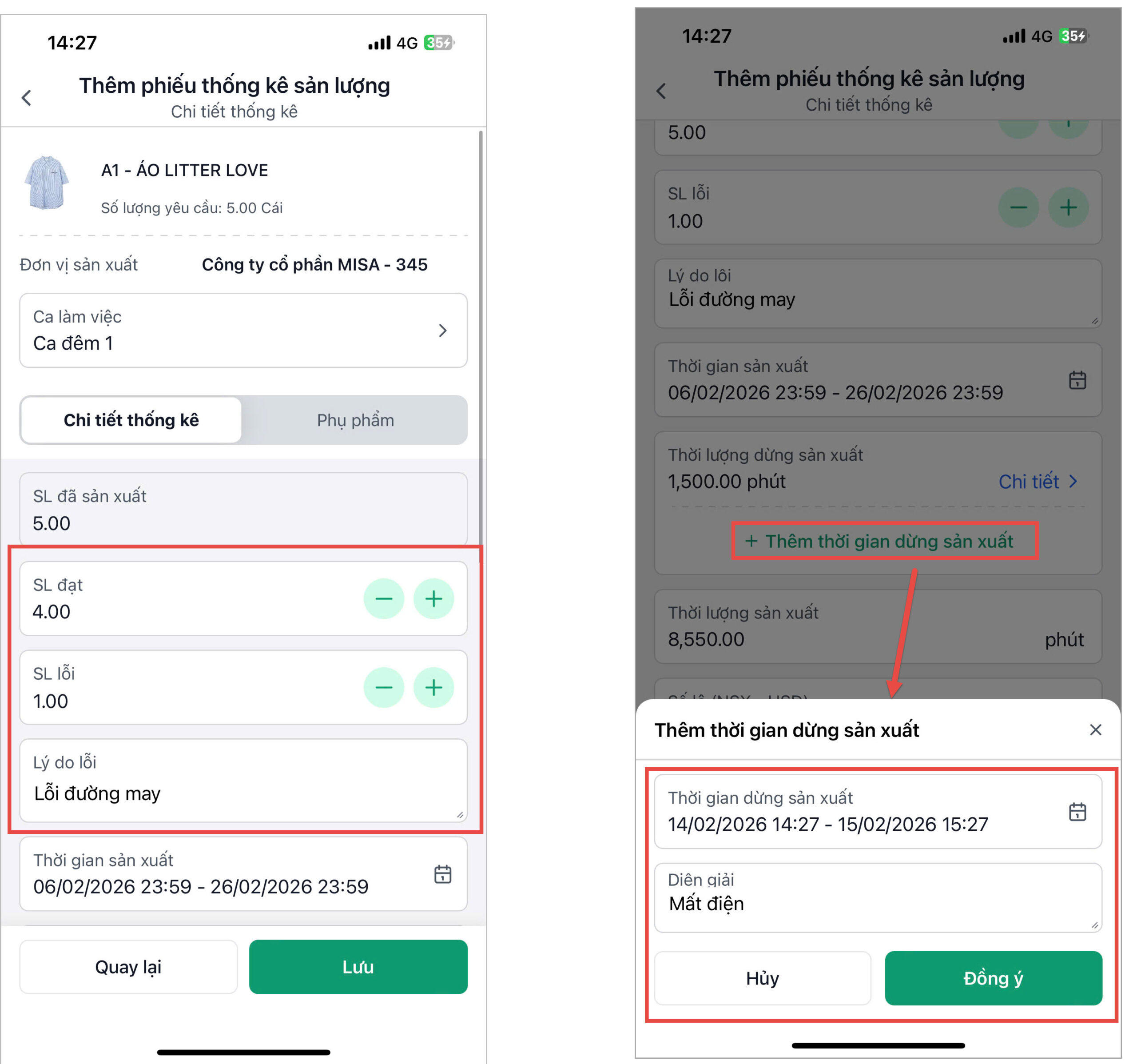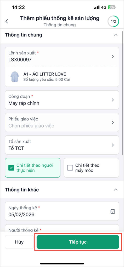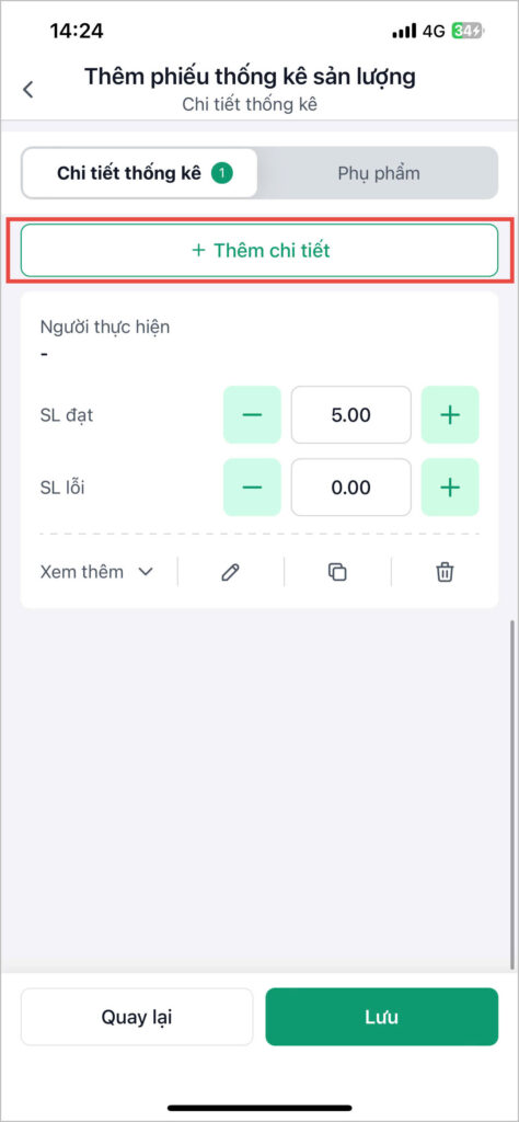 2.2.1. Thêm nhanh phiếu thống kê sản lượng1. Tại mục Tác vụ nhanh\Thống kê sản lượng, nhấn Thêm thống kê.