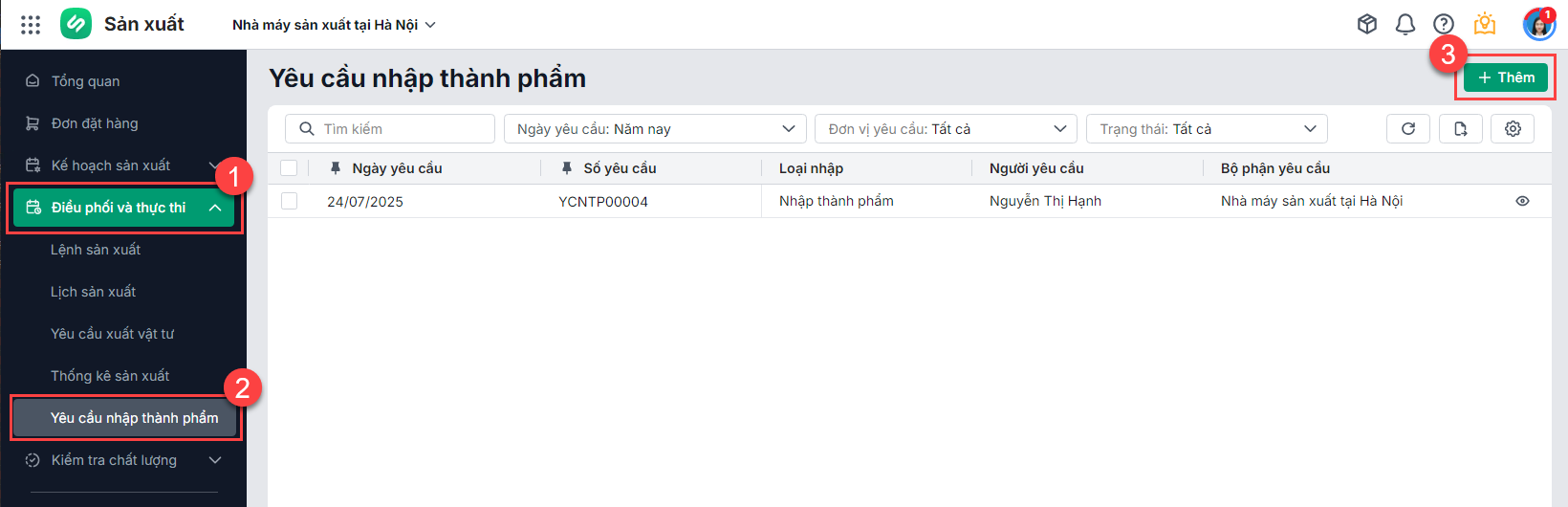 Lưu ý: Người dùng cần được phân quyền Nhập kho thành phẩm mới thực hiện được thao tác này.