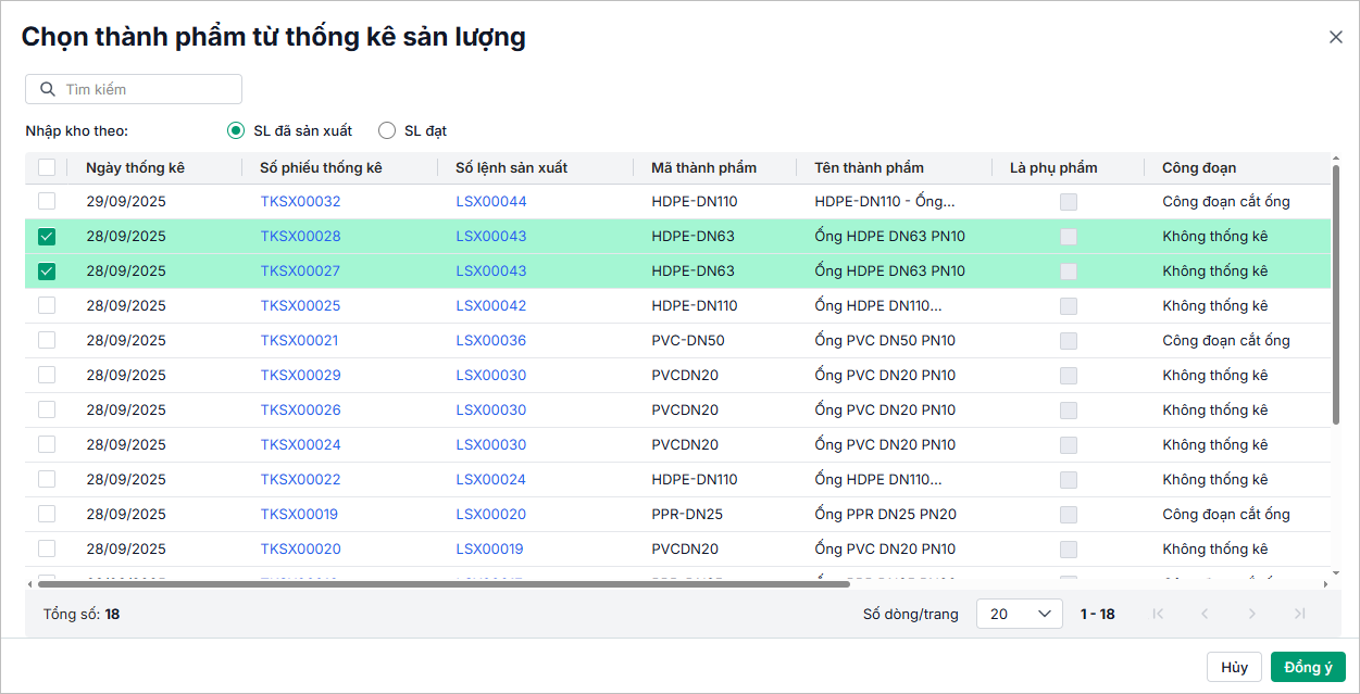 Lưu ý: Khi gửi Yêu cầu nhập thành phẩm sang Kho, các dòng phụ phẩm vẫn được đẩy sang và hiển thị như hàng hóa thông thường. Tuy nhiên, trên chứng từ nhập kho chưa hiển thị thông tin cột Là phụ phẩm để phân biệt với thành phẩm.