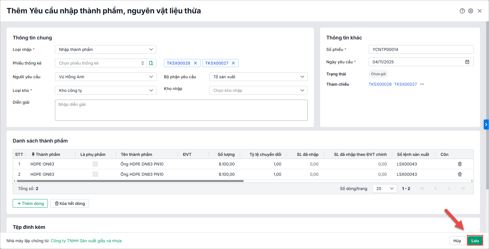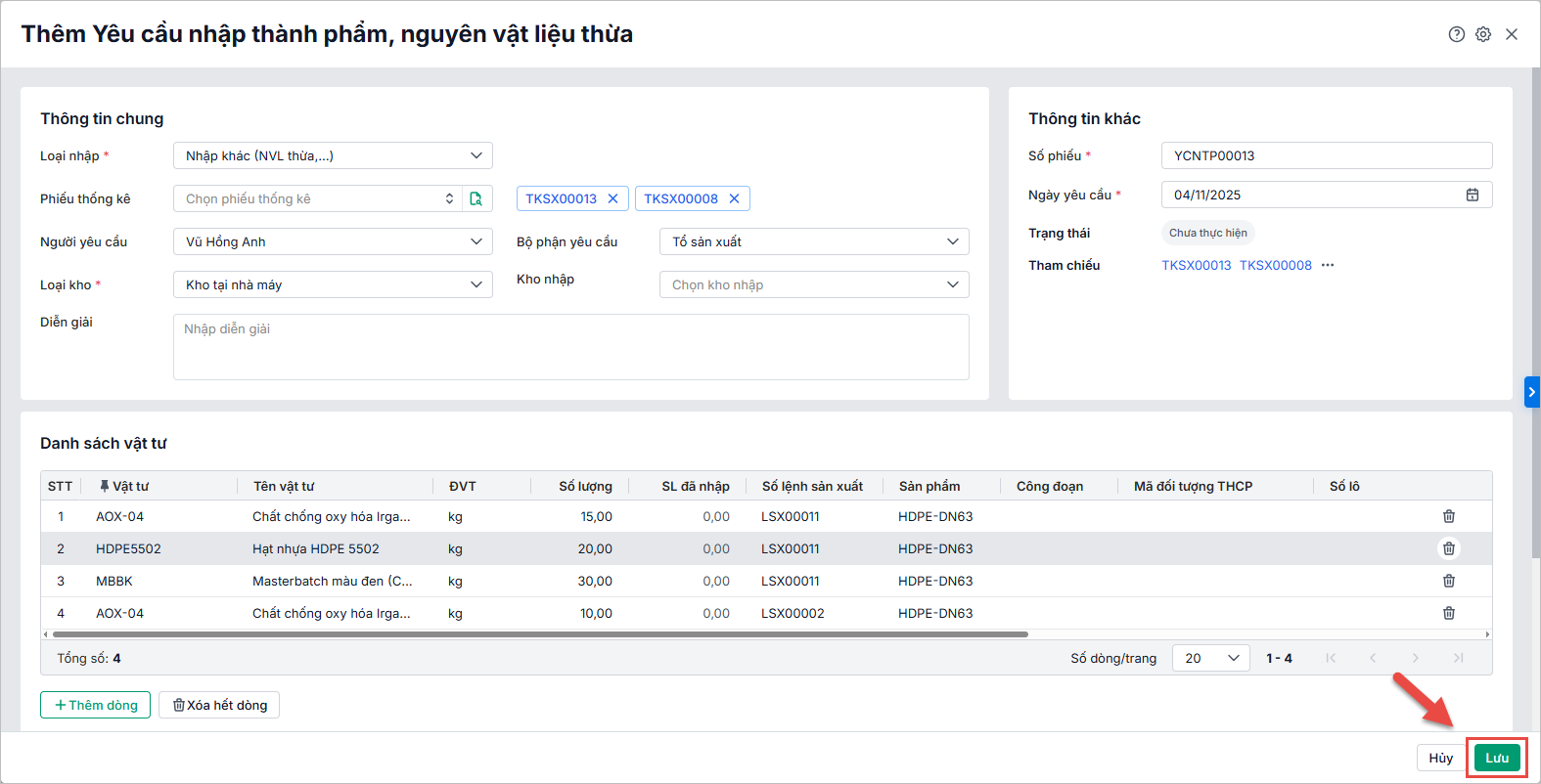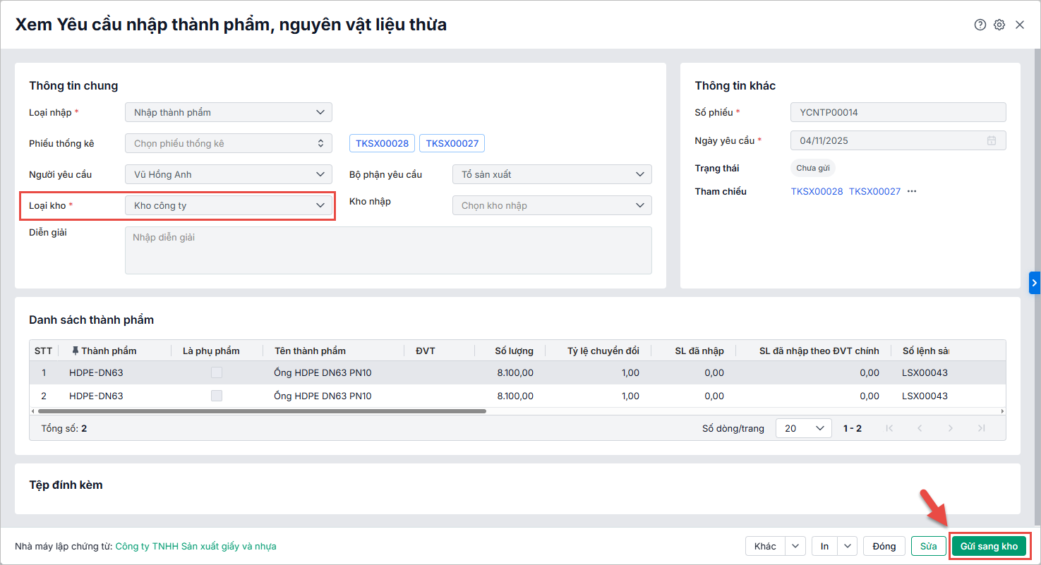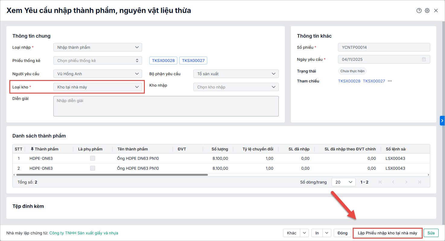 - Đối với loại yêu cầu nhập kho thành phẩm, nvl thừa là loại Kho tại nhà máy, anh chị có thể lập nhanh phiếu nhập kho tại nhà máy để cập nhật chính xác số lượng vật tư nhập kho tại nhà máy và đồng bộ dữ liệu giữa các bộ phận.
