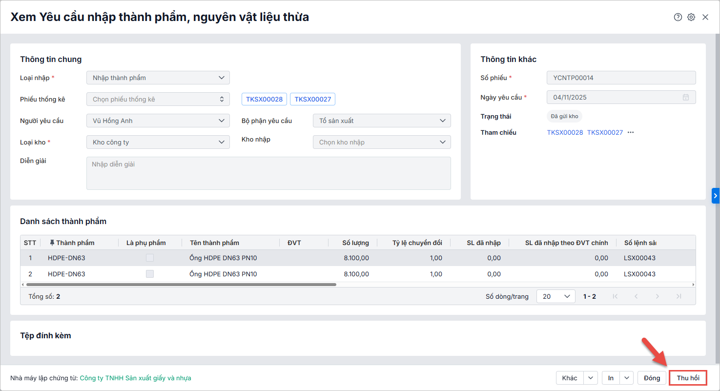 Trường hợp yêu cầu đã gửi sang kho, sang kế toán do nhầm lẫn hoặc có vấn đề phát sinh, anh/chị có thể nhấn “Thu hồi” yêu cầu nhập kho trên giao diện xem chi tiết, hoặc nhấn icon
