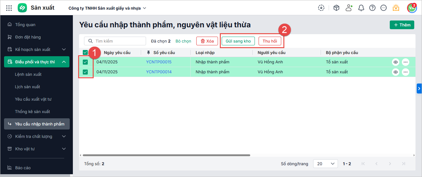 Lưu ý: Anh chị có thể Gửi sang kho hoặc Thu hồi hàng loạt yêu cầu nhập kho thành phẩm, nguyên vật liệu thừa tại danh sách chứng từ.