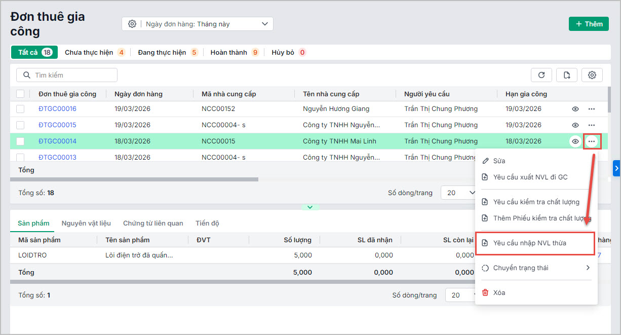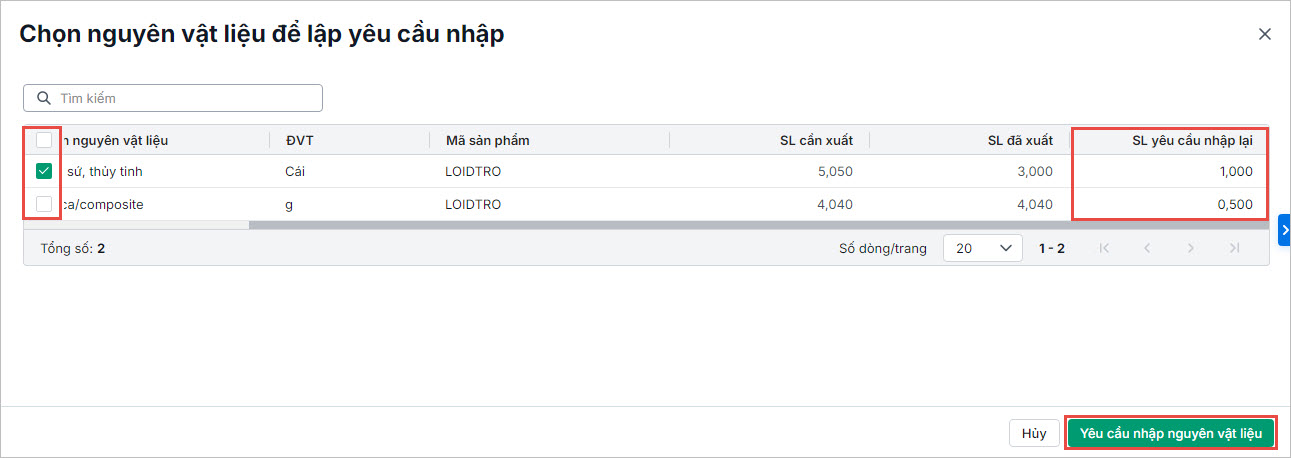 Lưu ý: Anh chị có thể Gửi sang kho hoặc Thu hồi hàng loạt yêu cầu nhập kho thành phẩm, nguyên vật liệu thừa tại danh sách chứng từ.