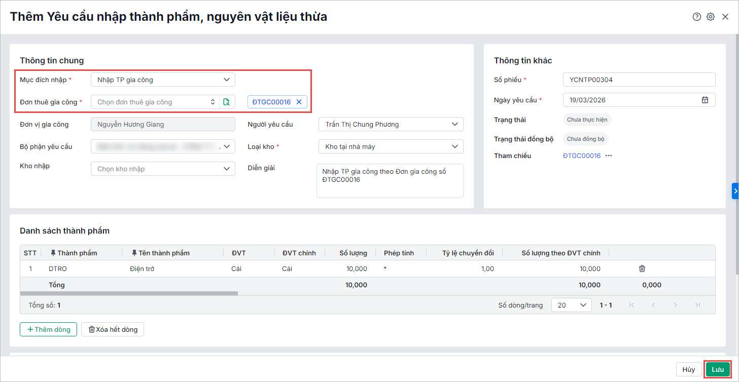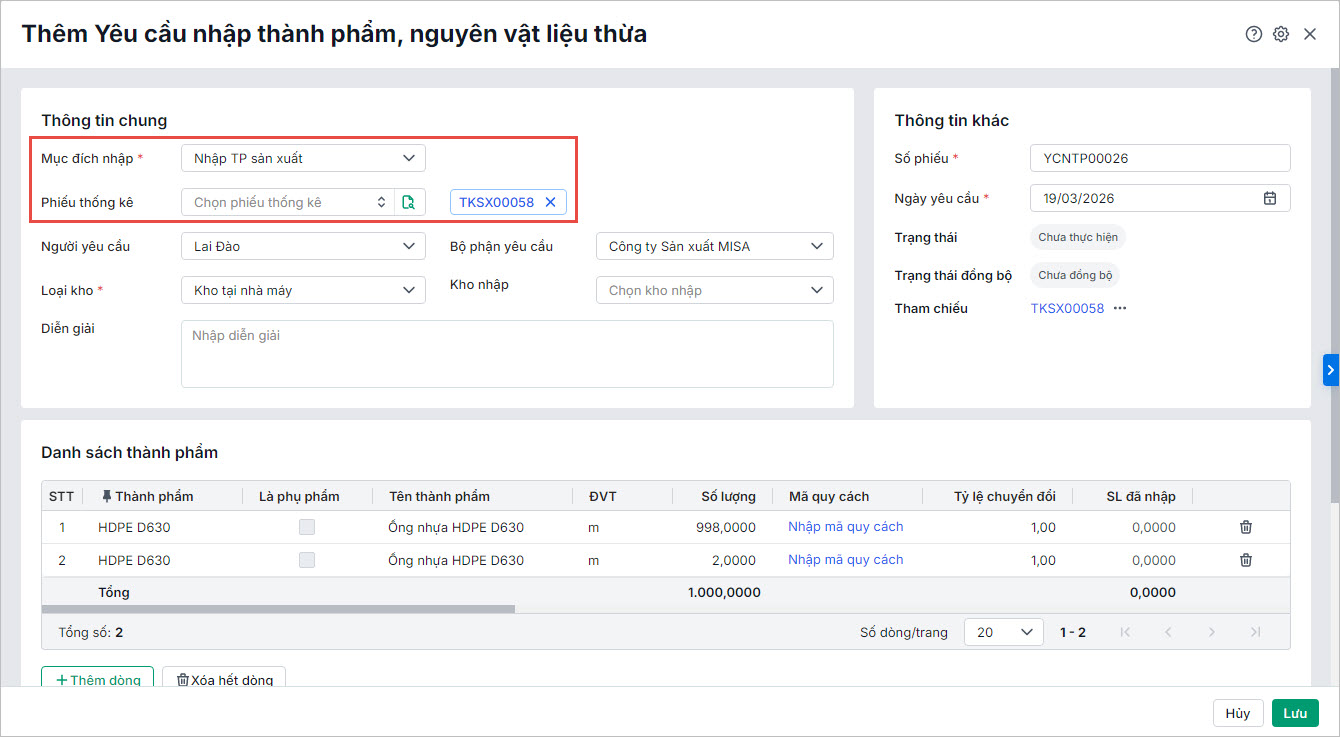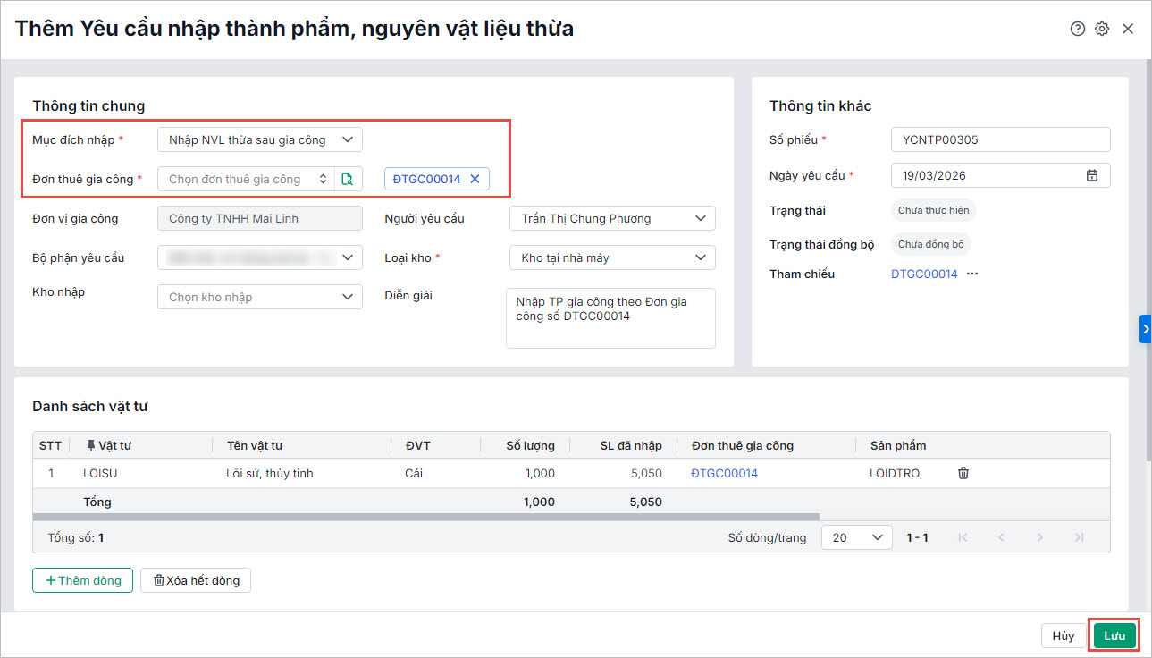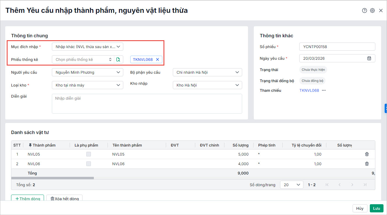 - Đối với loại yêu cầu nhập kho thành phẩm, nvl thừa là loại Kho tại nhà máy, anh chị có thể lập nhanh phiếu nhập kho tại nhà máy để cập nhật chính xác số lượng vật tư nhập kho tại nhà máy và đồng bộ dữ liệu giữa các bộ phận.