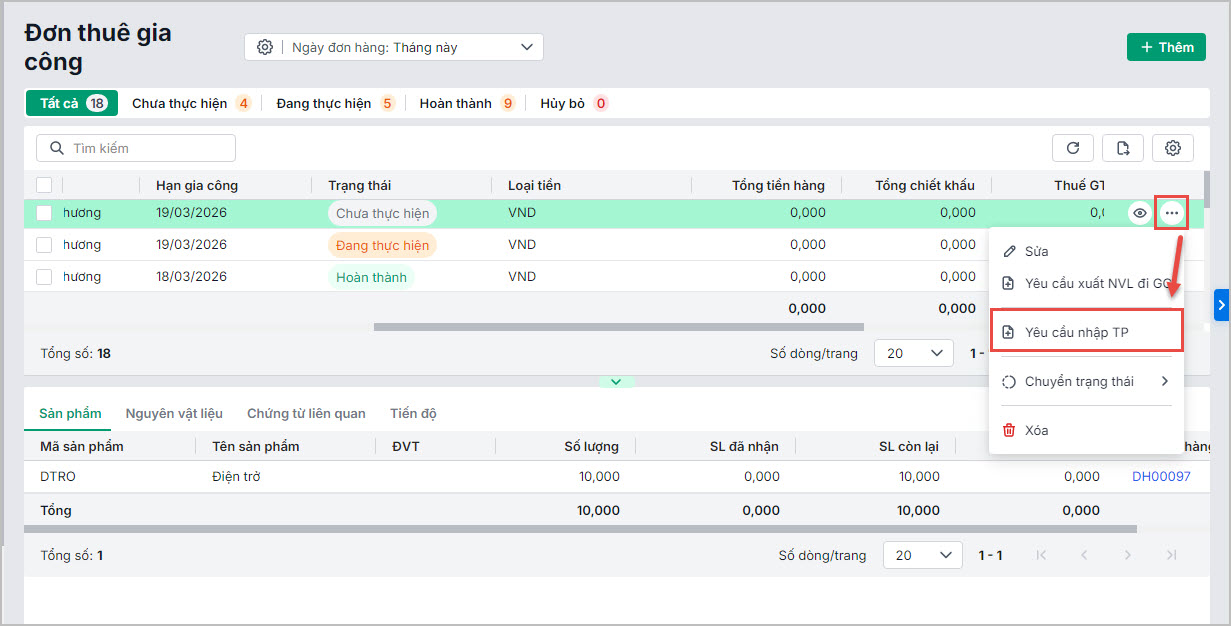 Lưu ý: Người dùng cần được phân quyền Nhập kho thành phẩm mới thực hiện được thao tác này.