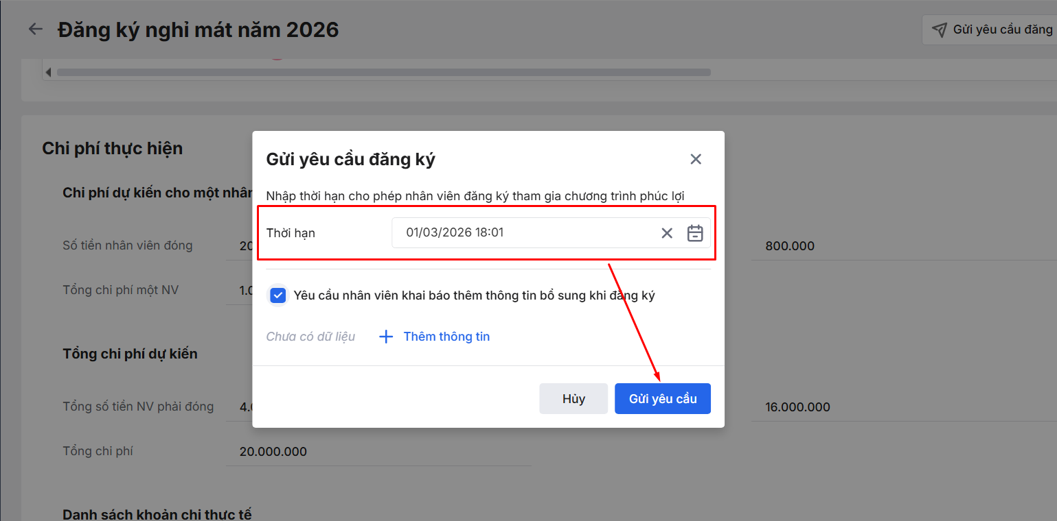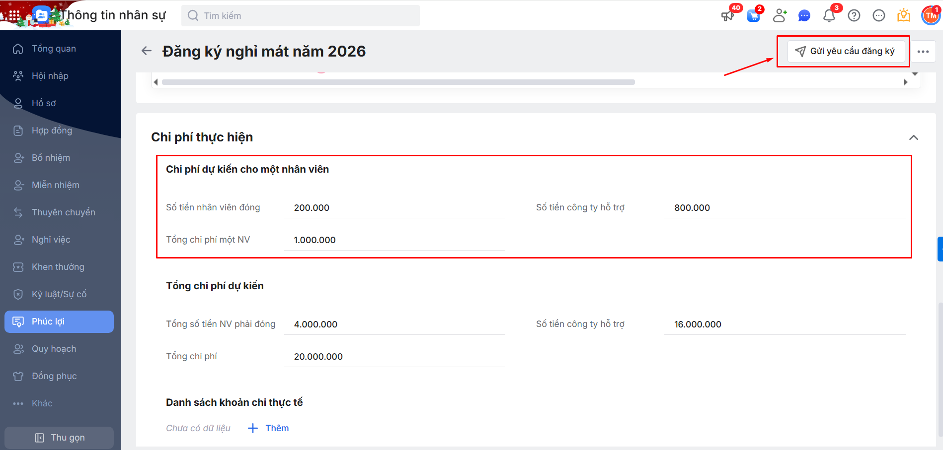 Bước 1: HR thêm chương trình phúc lợi ở phần Phúc lợi trên AMIS Thông tin nhân sự\ Nhấn gửi đăng ký đến các nhân viên có trong danh sách hưởng phúc lợi.