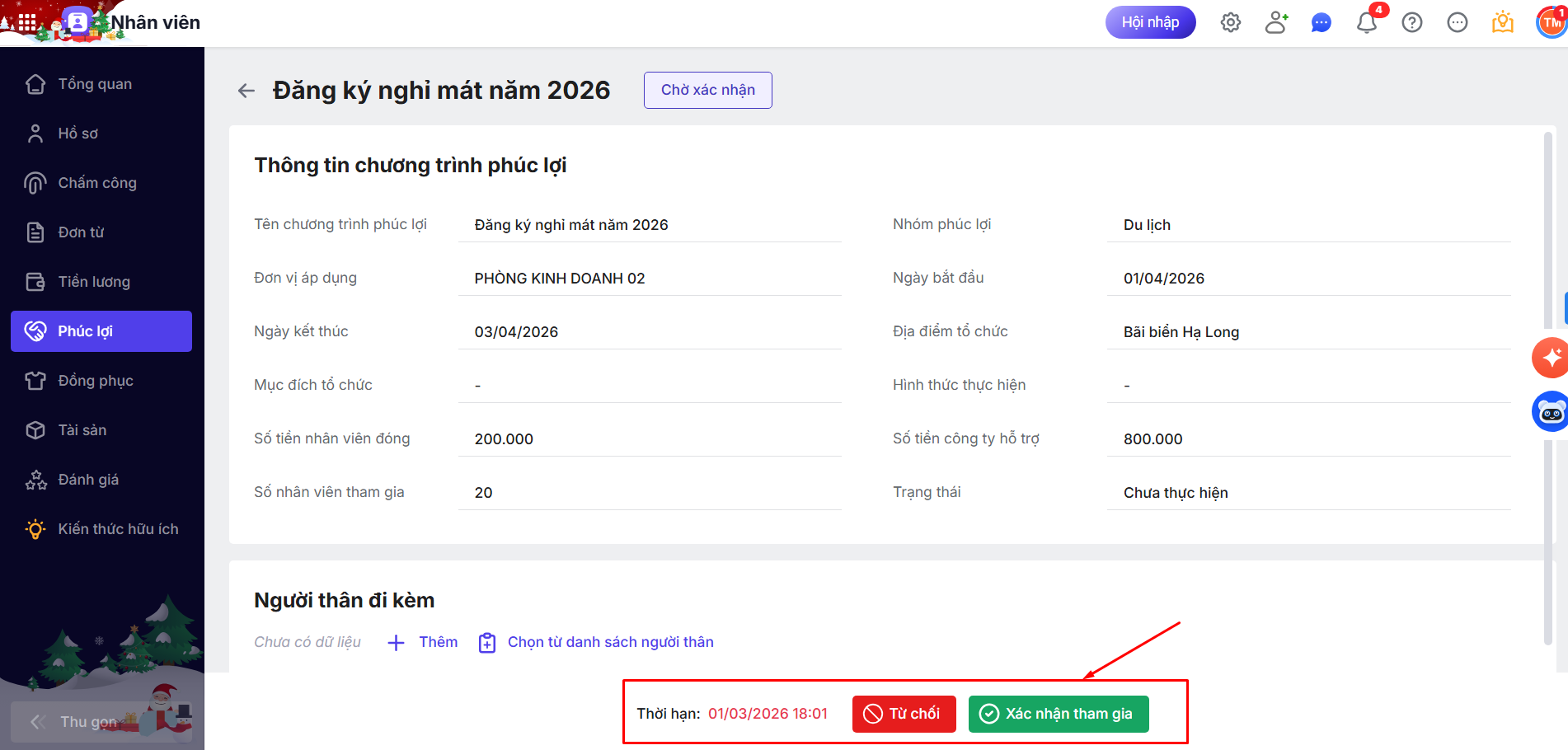 Bước 2: Nhân viên nhận được thông báo tại AMIS Nhân viên\ Phần Phúc lợi\ Hiển thị đầy đủ thông tin đợt phúc lợi bao gồm cả thông tin số tiền nhân viên cần đóng và số tiền công ty hỗ trợ\ Nhân viên nhấn Xác nhận tham gia hoặc Từ chối.