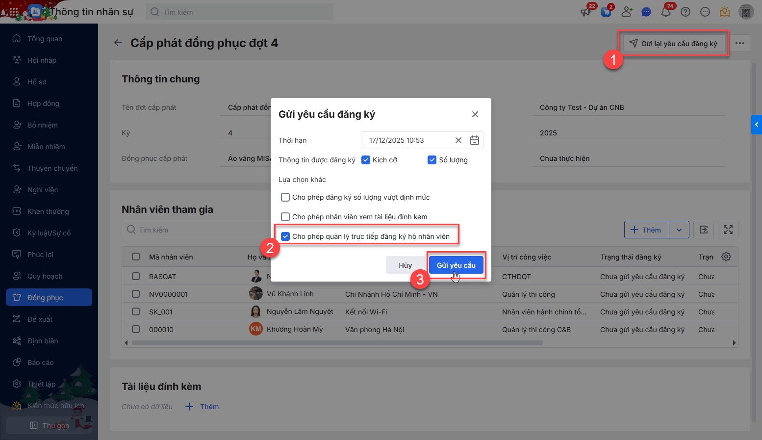 Bước 3: Chọn Cho phép quản lý trực tiếp đăng ký hộ nhân viên\nhấn Gửi yêu cầu.