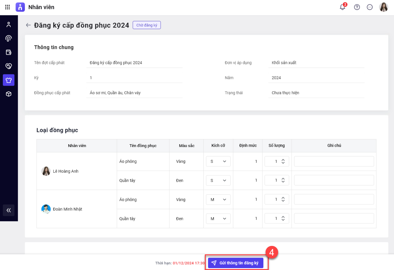 - Khi đó, tại AMIS Nhân viên và AMIS Mobile, quản lý sẽ nhìn thấy thông tin cấp phát đồng phục của các nhân viên thuộc quyền quản lý. Quản lý có thể chỉnh sửa thông tin số lượng, kích cỡ, ghi chú cho từng nhân viên (nếu còn thời hạn đăng ký). Sau đó nhấn Gửi thông tin đăng ký đến HR.