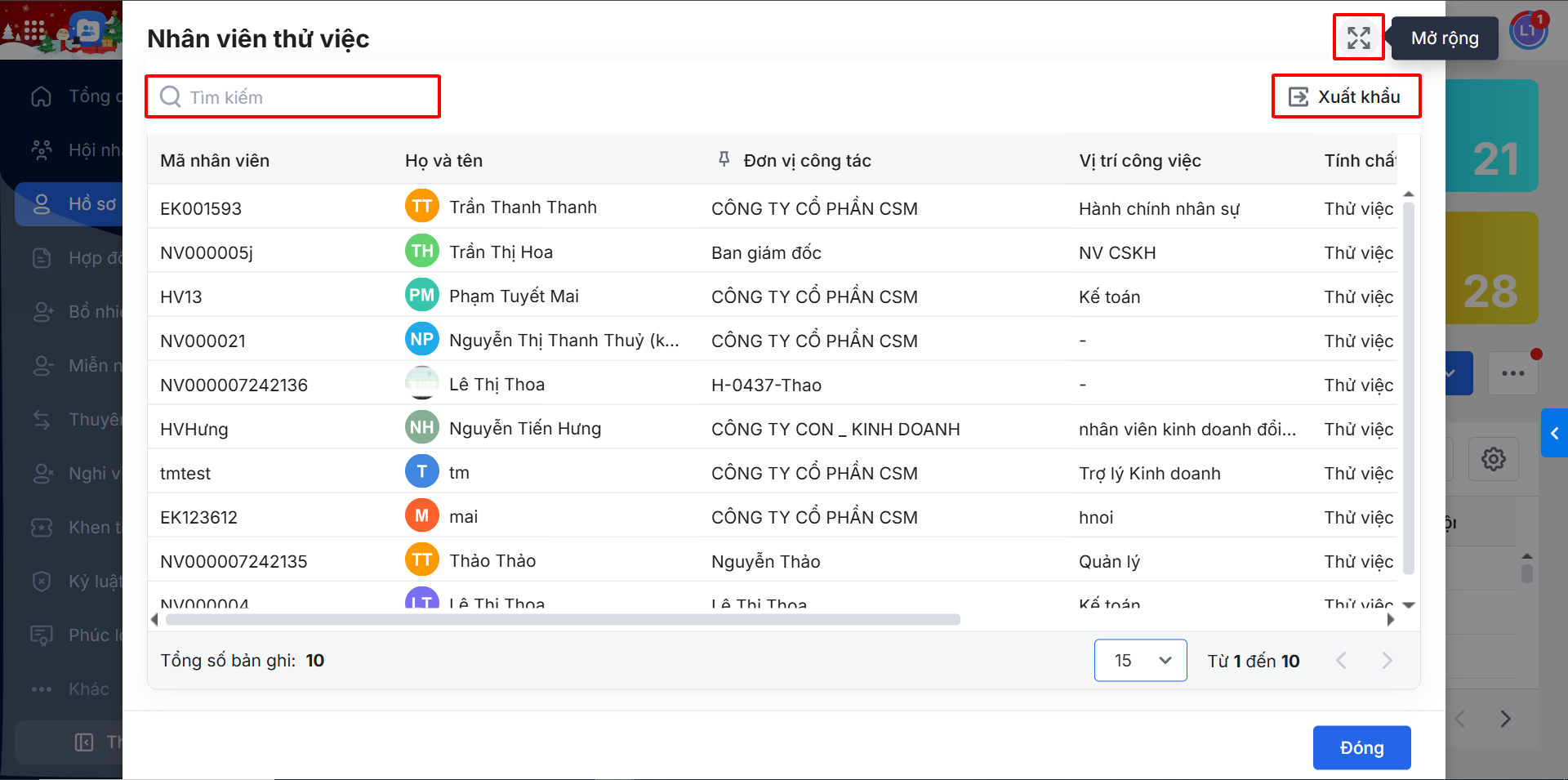 Bước 3: Khi xem danh sách nhân viên, HR có thể sử dụng thêm các tiện ích để tiện theo dõi như: tìm kiếm nhân viên, xuất khẩu danh sách nhân viên, phóng to/thu nhỏ.