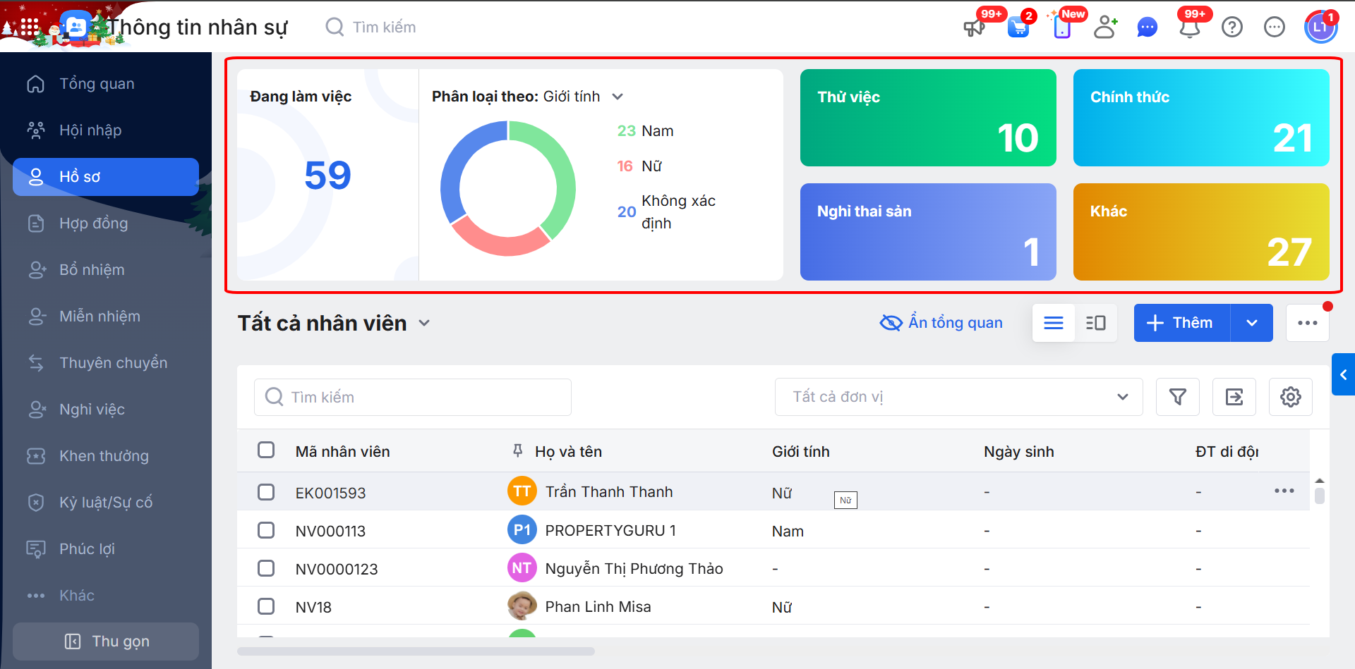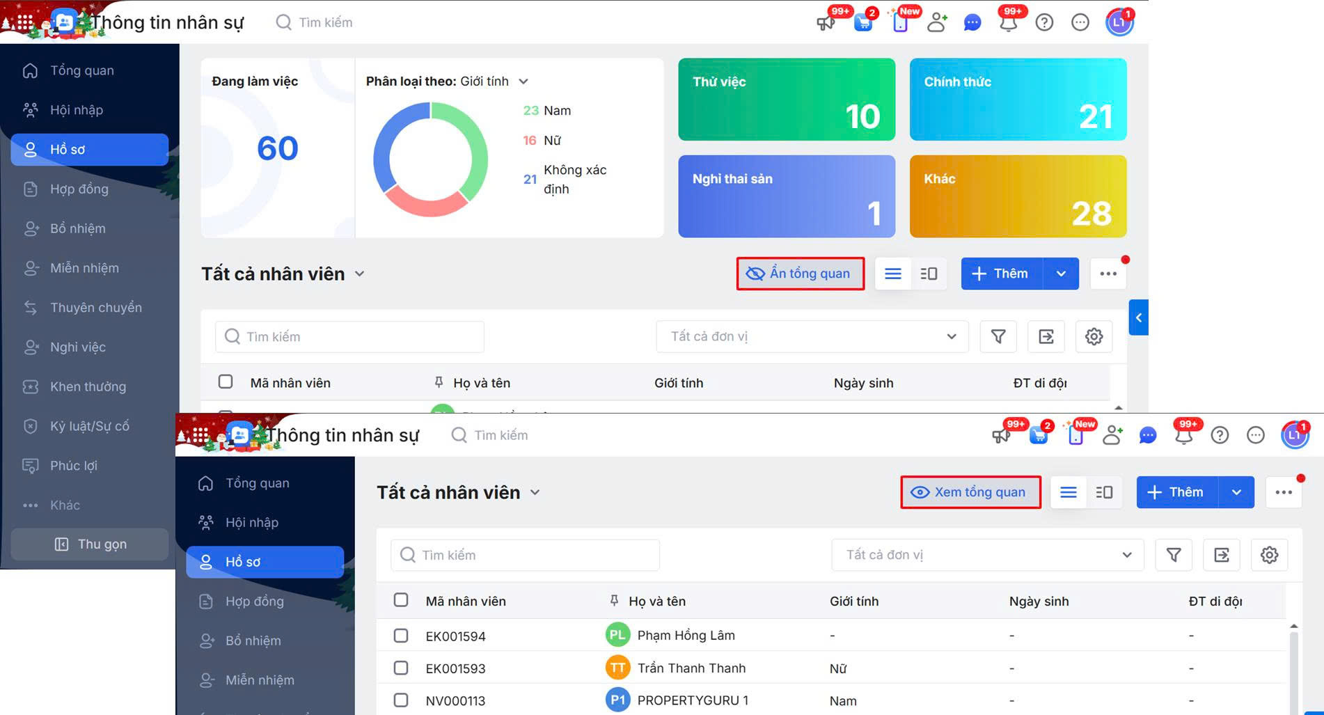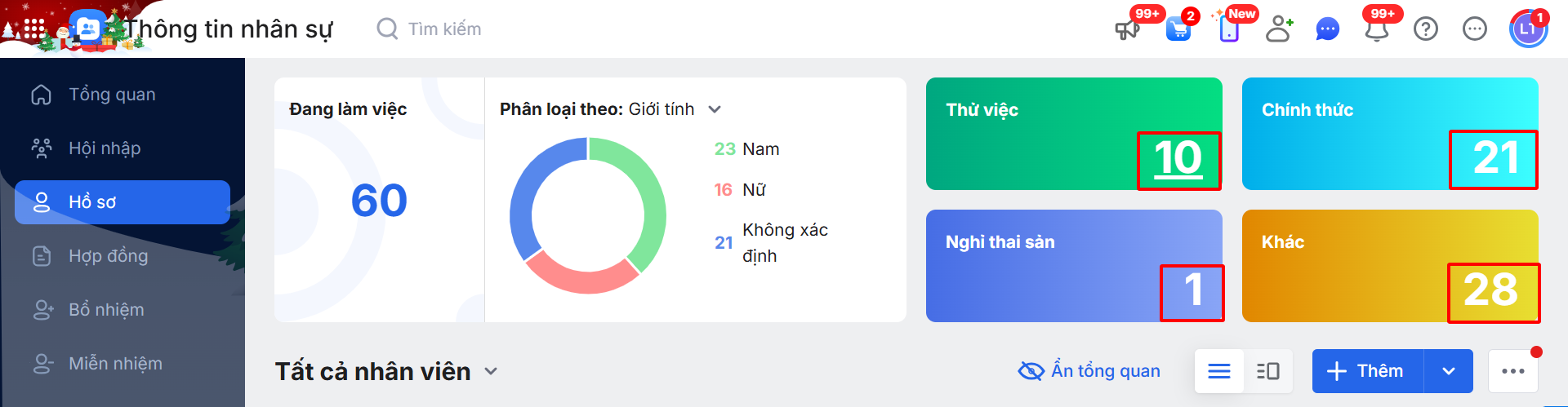 - Chính thức: Là tổng số hồ sơ có trạng thái lao động là Đang làm việc và có tính chất lao động là Chính thức trong phạm vi quyền hạn của người dùng (trừ Hồ sơ đã chuyển vào Thùng rác)