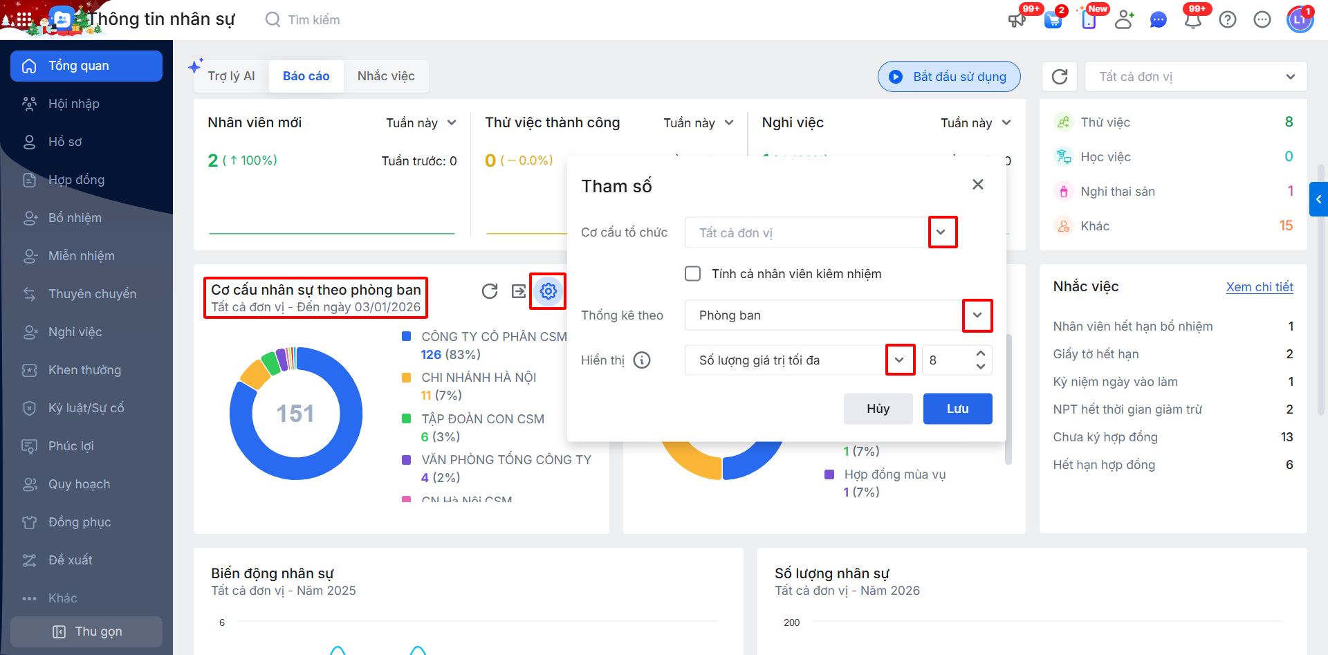 - Tổng số nhân viên: Lấy dữ liệu từ mục thông tin công việc trong Hồ sơ nhân viên.