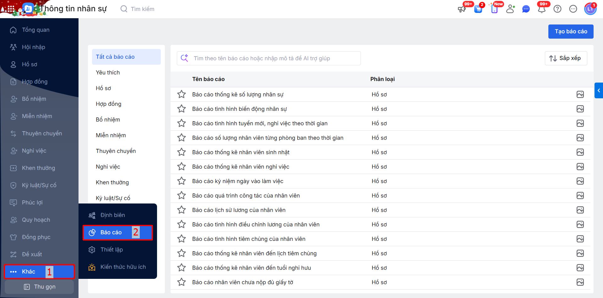 Ngoài ra, HR có thể tự tạo báo cáo về tình hình nhân sự theo nhu cầu cá nhân hoặc biểu mẫu riêng mà doanh nghiệp đang sử dụng khác với các báo cáo có sẵn của chương trình. Xem hướng dẫn chi tiết tại đây.