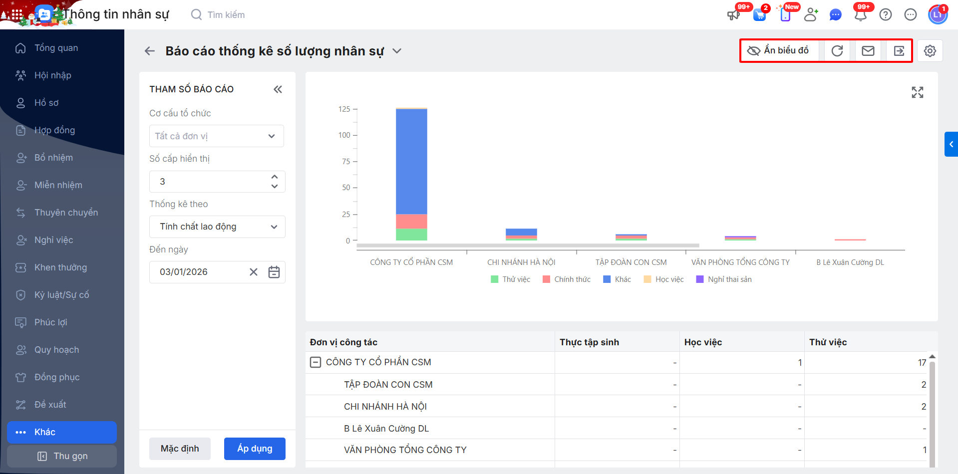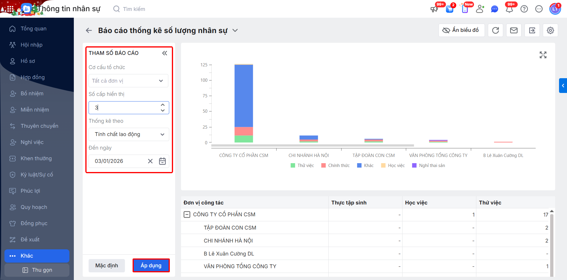 Ví dụ: Xem báo cáo Thống kê số lượng nhân sự.
