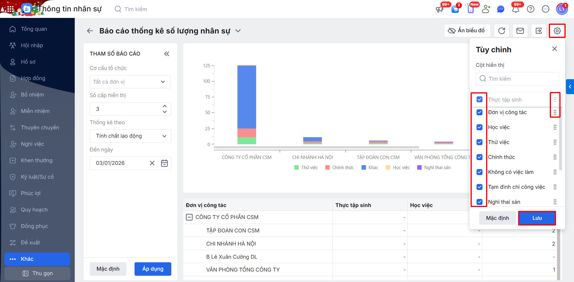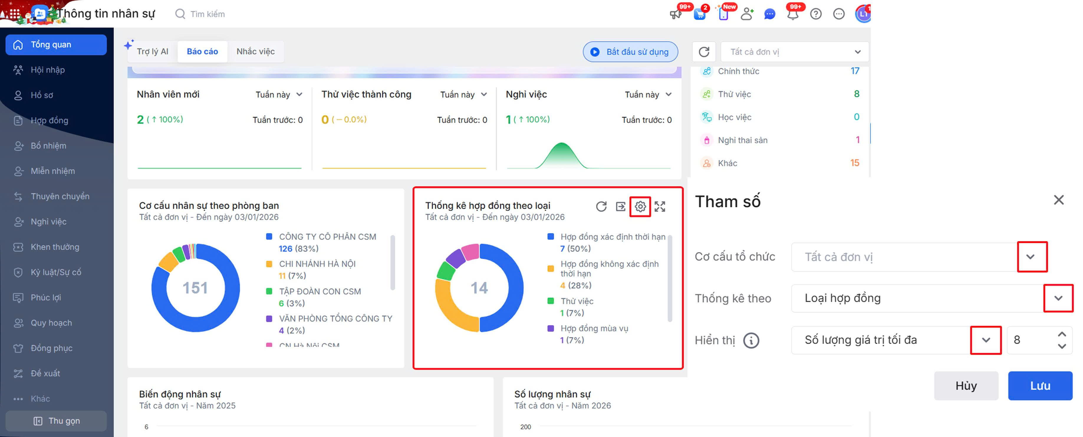 Nhấn biểu tượng bánh răng ⚙ để thiết lập tham số xem biểu đồ Thống kê hợp đồng nhân sự theo Loại hợp đồng/Thời hạn hợp đồng \ sau đó nhấn Lưu.