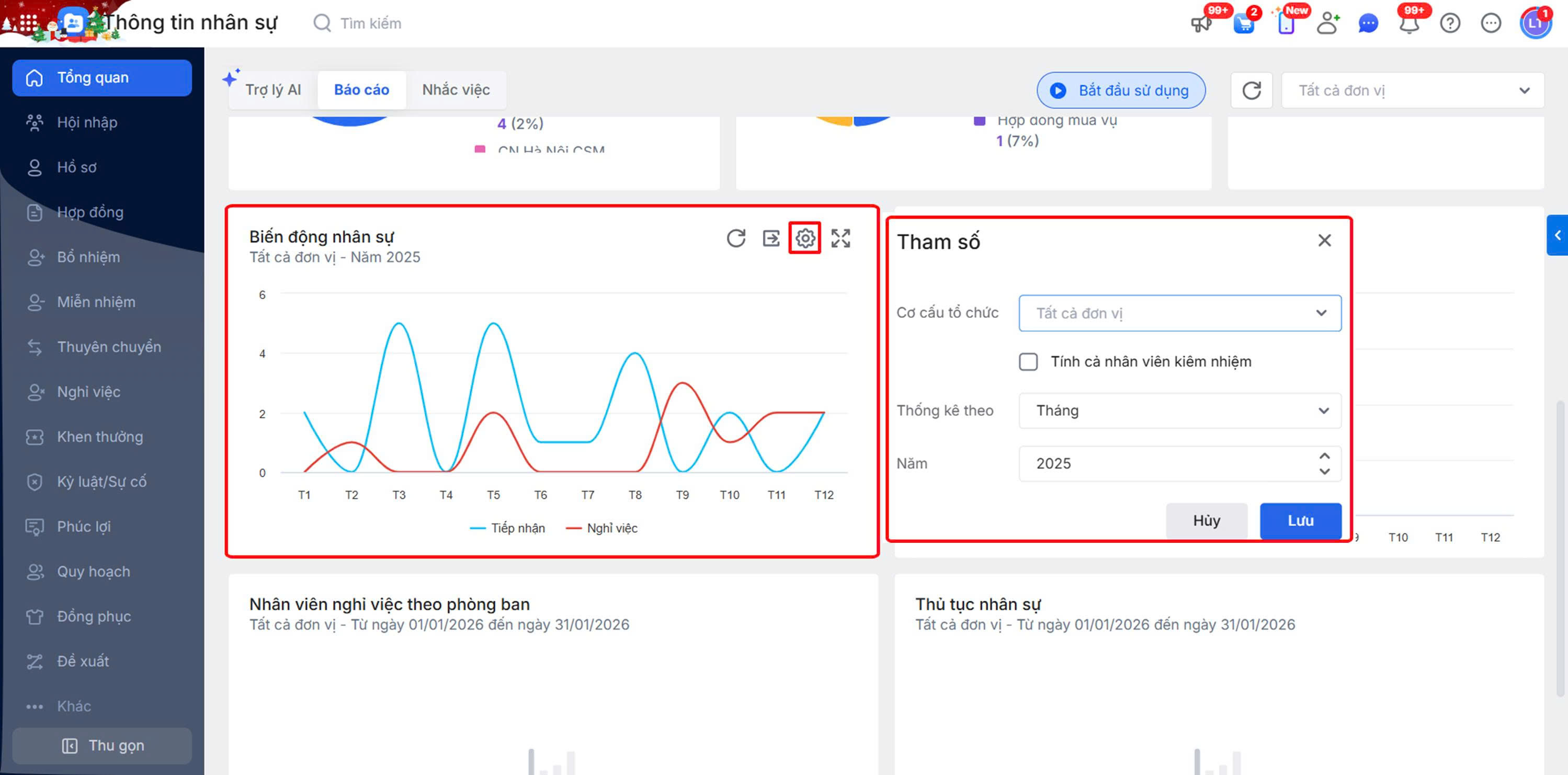 Nhấn biểu tượng bánh răng ⚙ để thiết lập tham số xem biểu đồ Biến động nhân sự theo Tháng/Quý/Năm \ sau đó nhấn Lưu để xem biểu đồ.