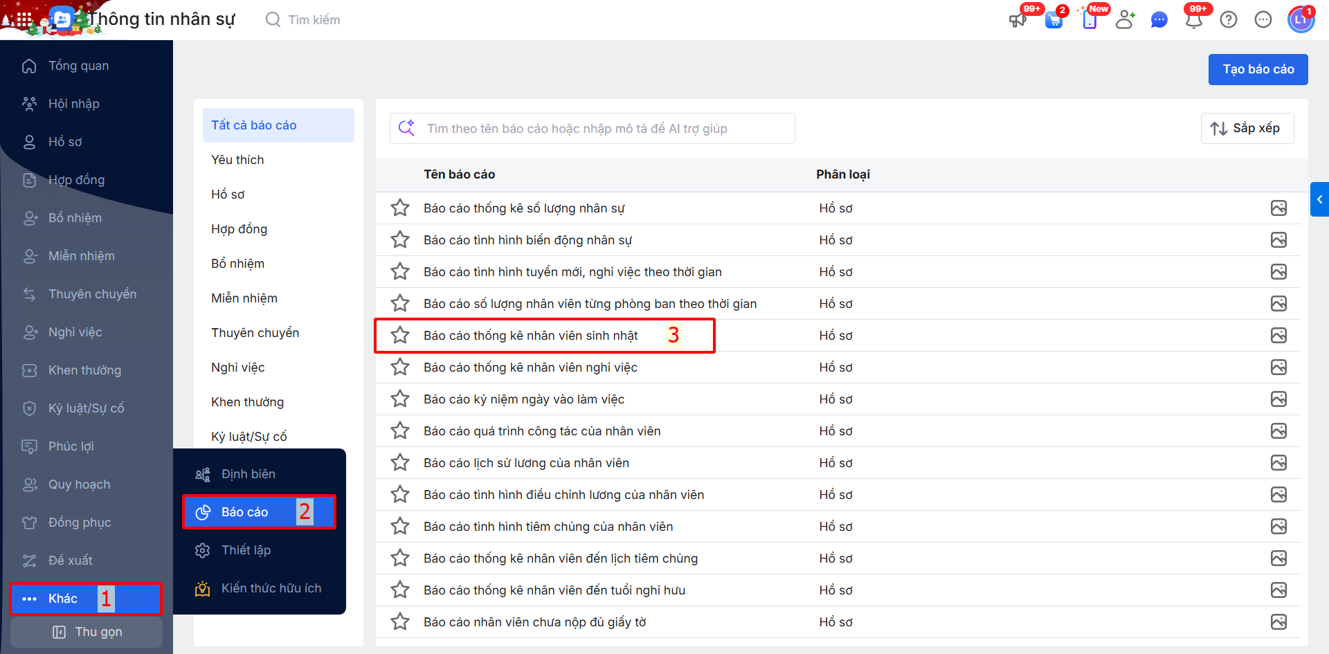 Bước 1: Vào mục Khác \ chọn phân hệ Báo cáo \ chọn Báo cáo thống kê nhân viên sinh nhật