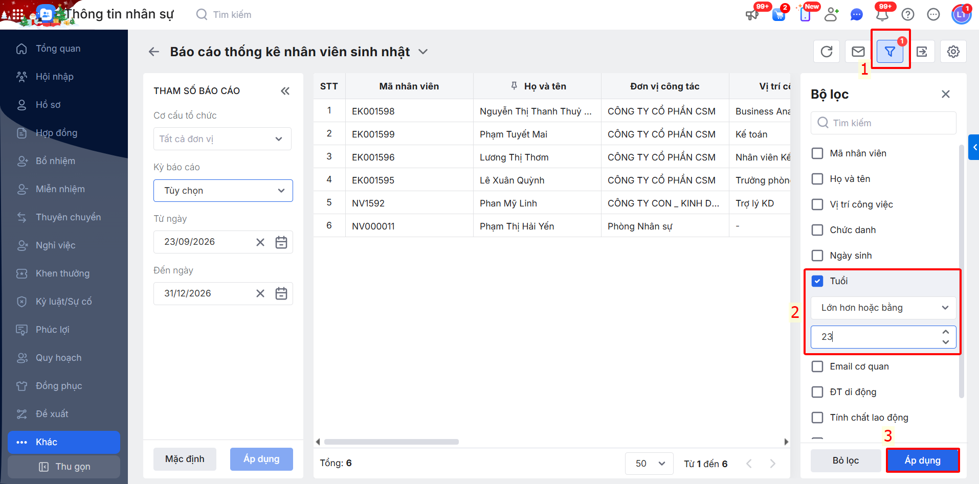 Ví dụ: Tại Báo cáo thống kê nhân viên sinh nhật, lọc danh sách nhân viên theo độ tuổi để chuẩn bị quà sinh nhật phù hợp.