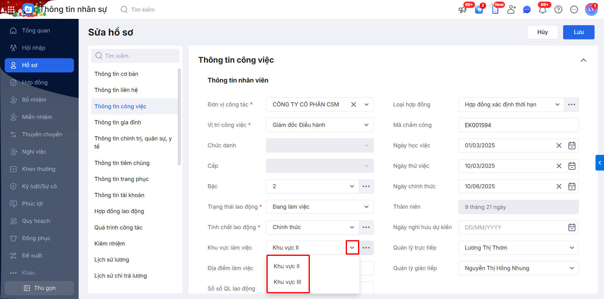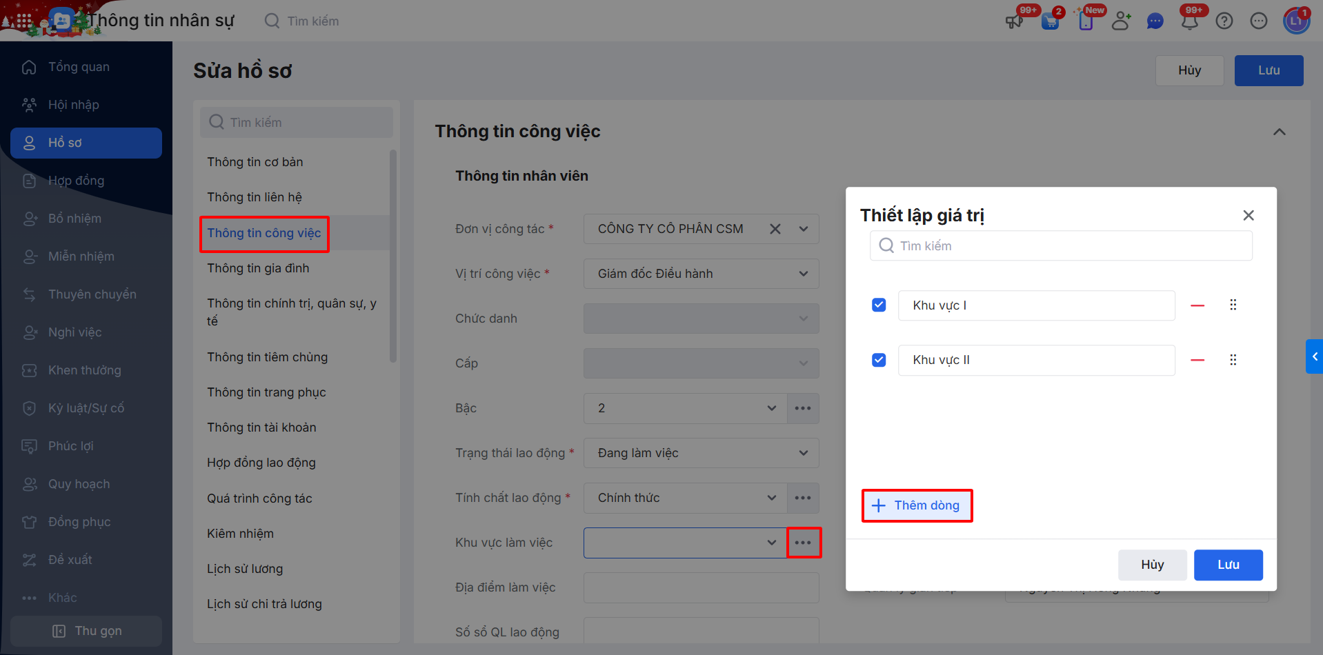 Bước 2: Ở chi tiết bản ghi \ vào mục Thông tin công việc \ bổ sung thêm khu vực làm việc