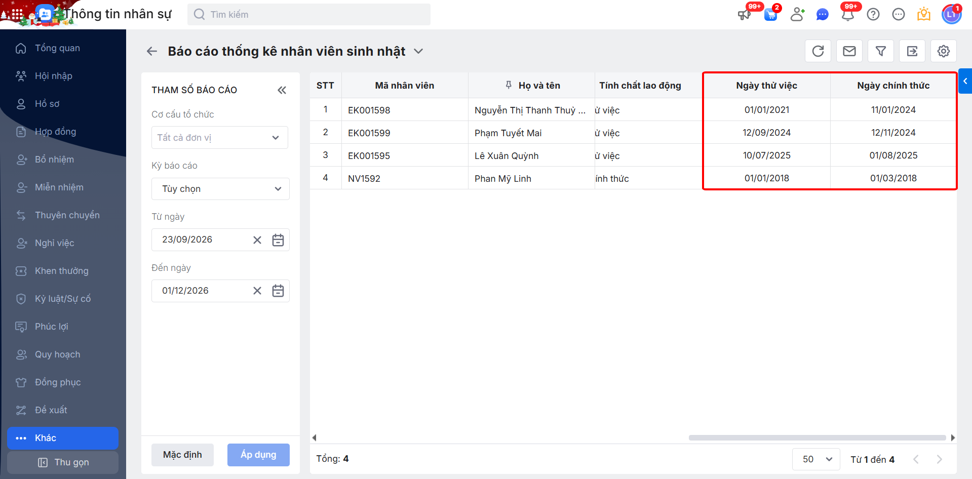 4. Bổ sung thông tin ngày thử việc và ngày chính thức trên báo cáo thống kê nhân viên sinh nhật