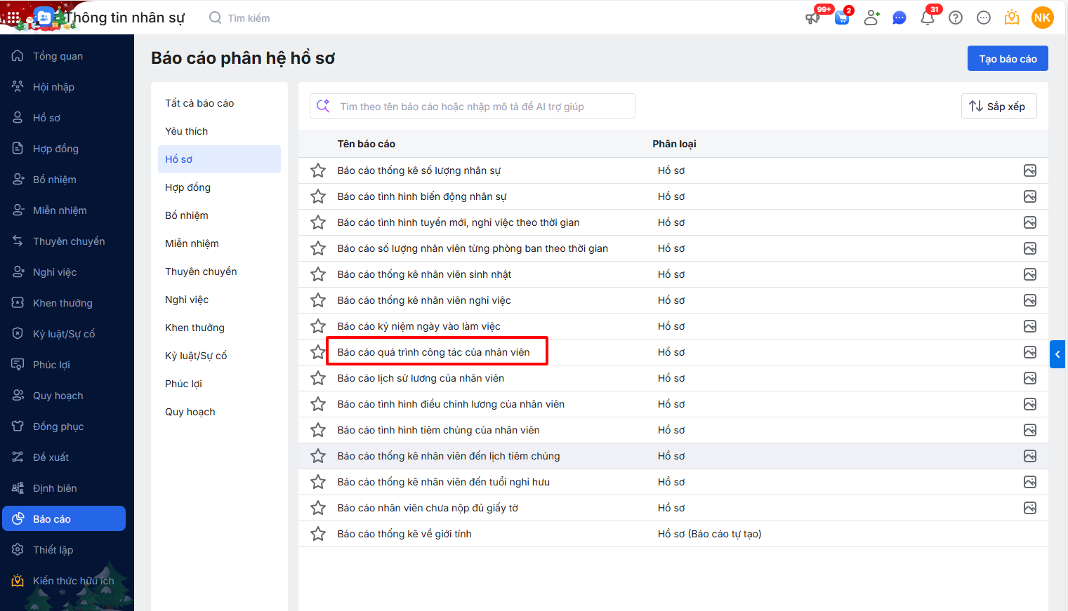 Bước 3: Truy cập vào phân hệ Báo cáo\Hồ sơ\|Báo cáo quá trình công tác của nhân viên.