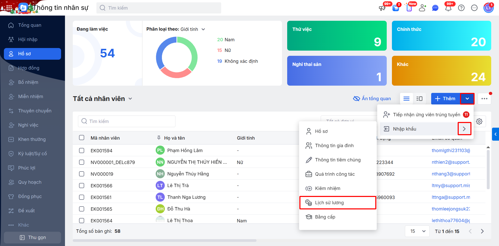 Bước 1: Tại phân hệ Hồ sơ, nhấn mũi tên xuống ⏷ \ nhấn Nhập khẩu \ chọn Lịch sử lương