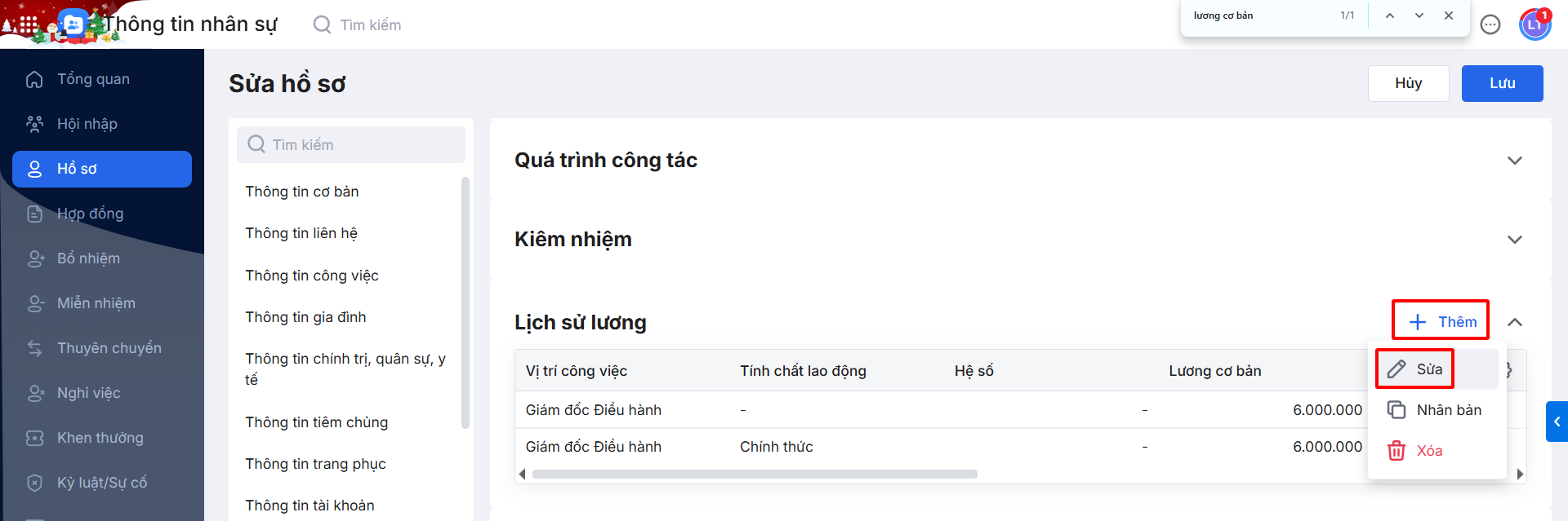 Bước 1: Vào chi tiết Hồ sơ \ nhấn Sửa \ sau đó kéo xuống phần Lịch sử lương