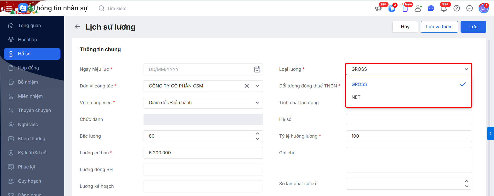 Bước 3: Khi khai báo lịch sử lương của nhân viên, HR cần khai báo thêm thông tin Loại lương (NET/GROSS) = > Chương trình sẽ đồng bộ dữ liệu này với AMIS Tiền lương.