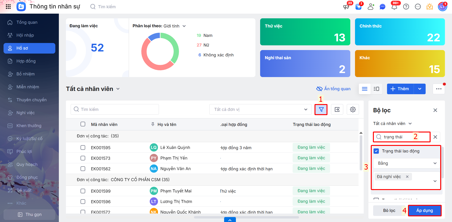Bước 1: Vào phân hệ Hồ sơ \ nhấn biểu tượng Lọc \ tìm kiếm Trạng thái lao động chứa Đã nghỉ việc \ sau đó nhấn Áp dụng để lọc ra danh sách nhân viên đã nghỉ việc.