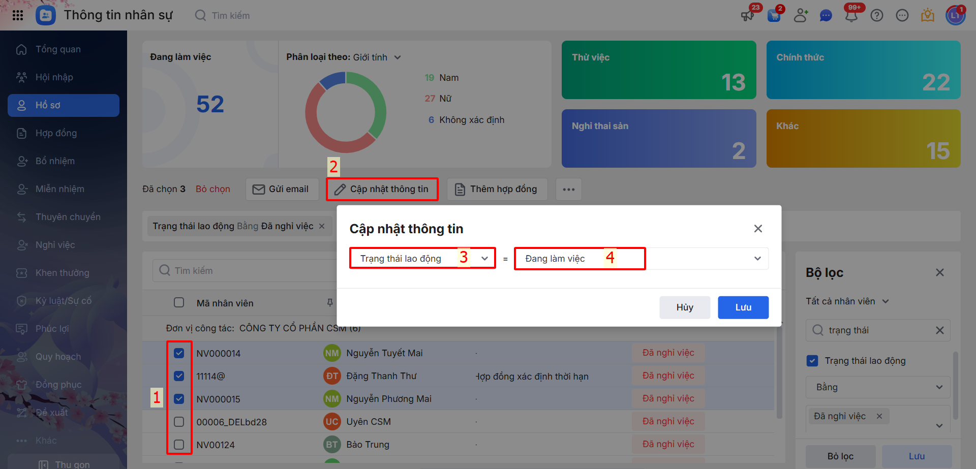 4. Cập nhật lại hàng loạt trạng thái lao động Đã nghỉ việc thành Đang làm việc