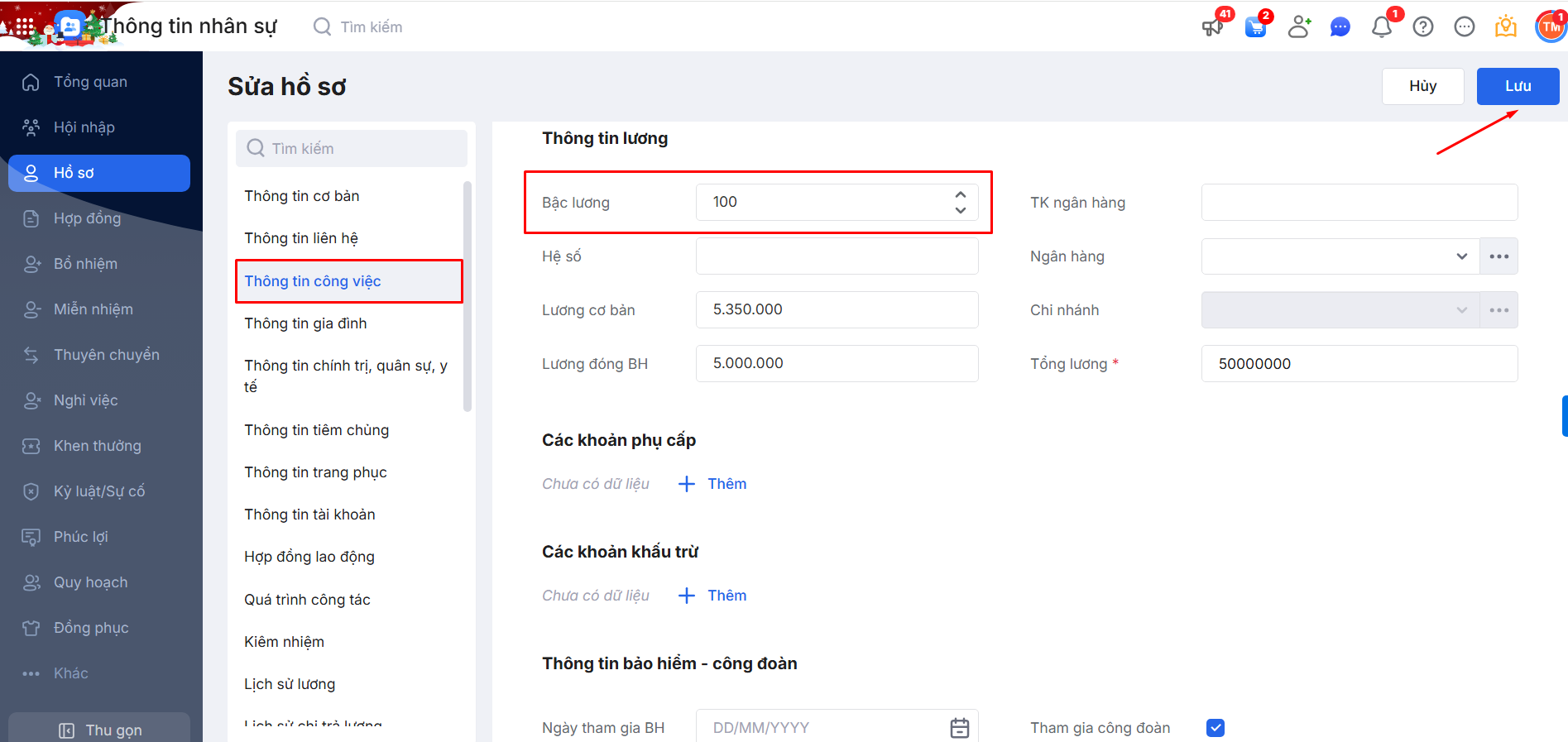 • Khai báo bậc lương > 12, tối đa 100 trong Hồ sơ nhân sự.