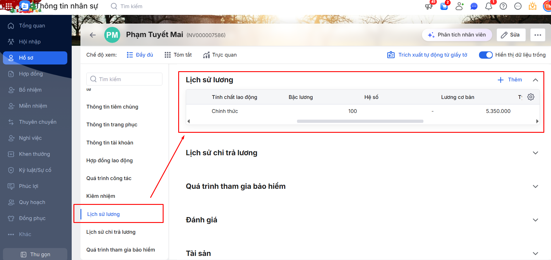 Bước 2: Tại Hồ sơ\ Kéo xuống Lịch sử lương\ Kiểm tra các Bậc lương theo lịch sử lương của nhân viên.