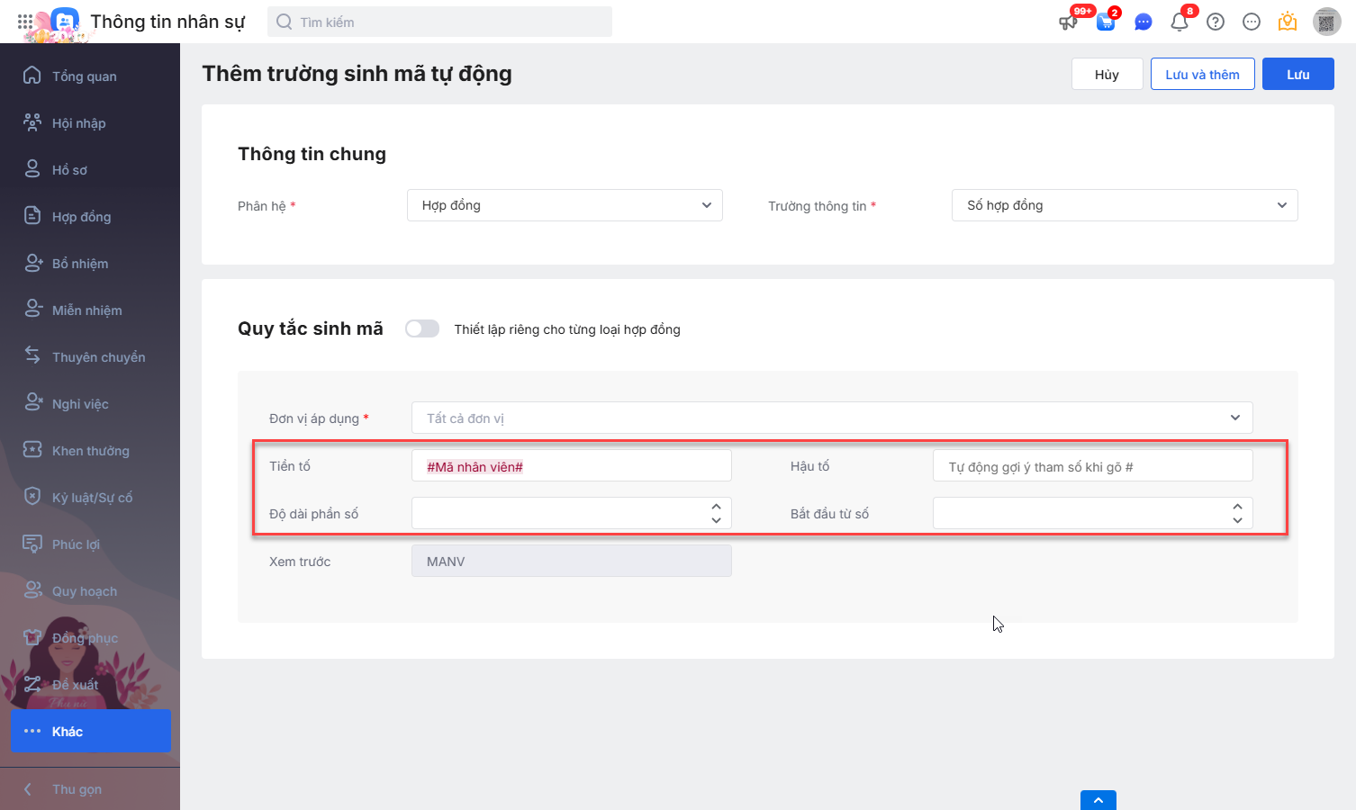 Giúp HR không cần thiết lập độ dài phần số khi thiết lập trường sinh mã tự động cho số hợp đồng để phù hợp với yêu cầu thực tế của đơn vị.