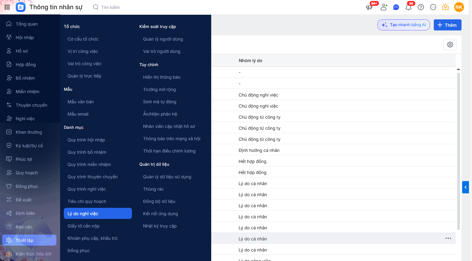 Bài viết hướng dẫn các thao tác để khai báo và quản lý danh mục Lý do nghỉ việc trên hệ thống. Việc xây dựng một danh mục lý do chuẩn hóa là nền tảng quan trọng, giúp HR ghi nhận thông tin nghỉ việc của nhân viên một cách nhất quán, từ đó có cơ sở để làm báo cáo, thống kê và phân tích chính xác nguyên nhân biến động nhân sự trong công ty.