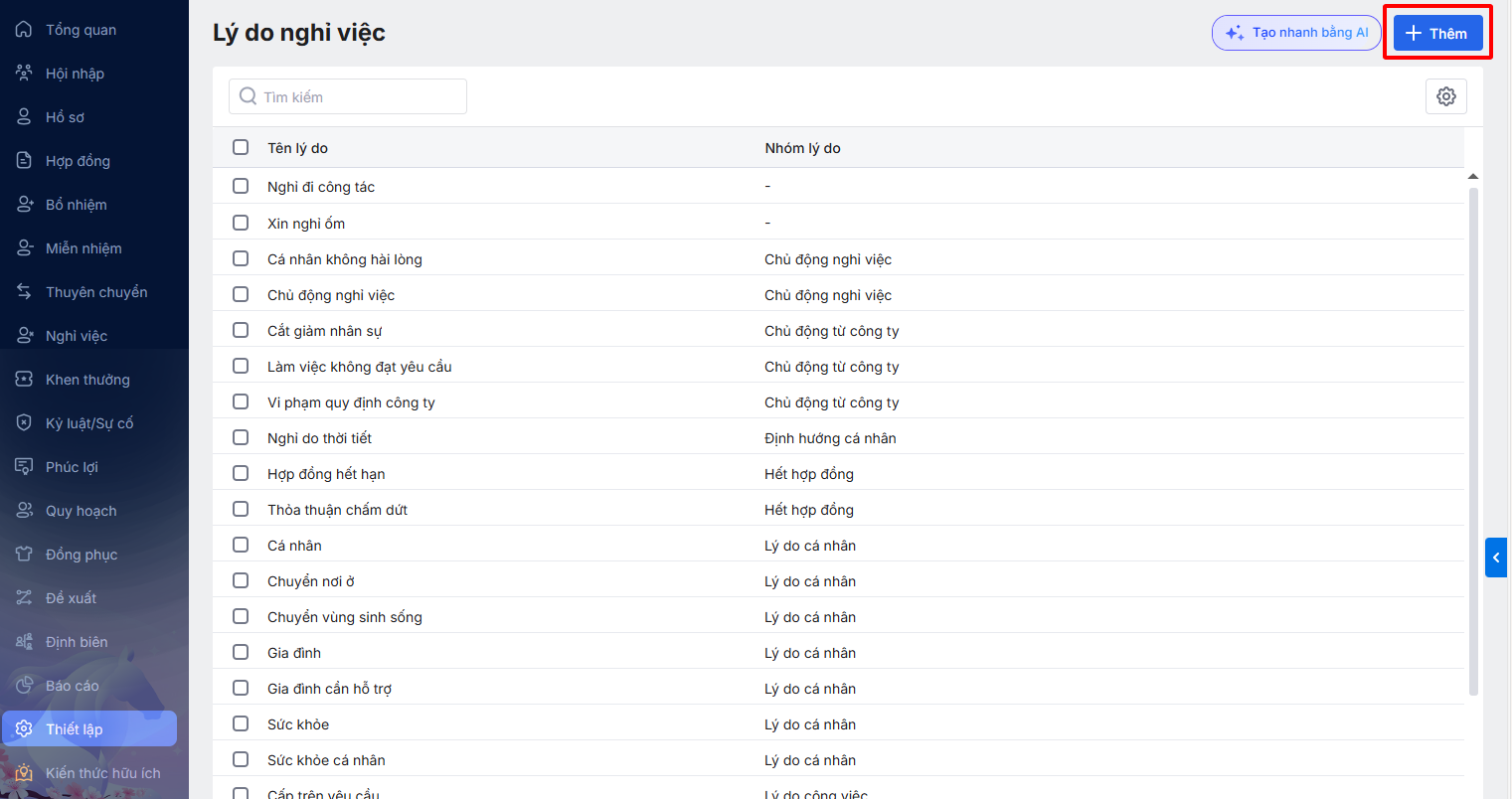 Bước 2: Nhấn Thêm để khai báo lý do nghỉ việc mới.