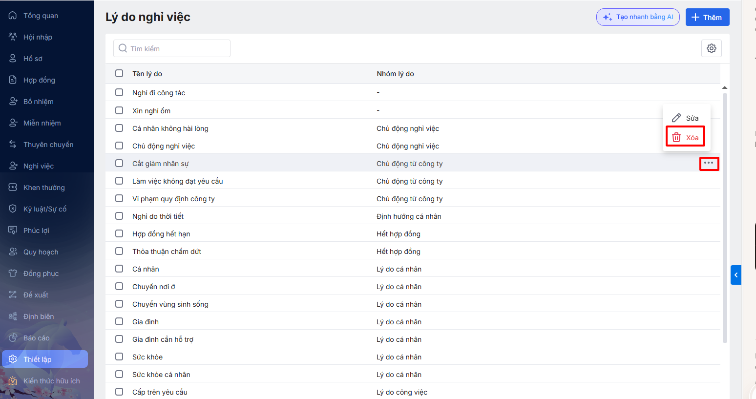 Bước 2: Tại màn hình danh sách lý do nghỉ việc: nhấn biểu tượng ba chấm