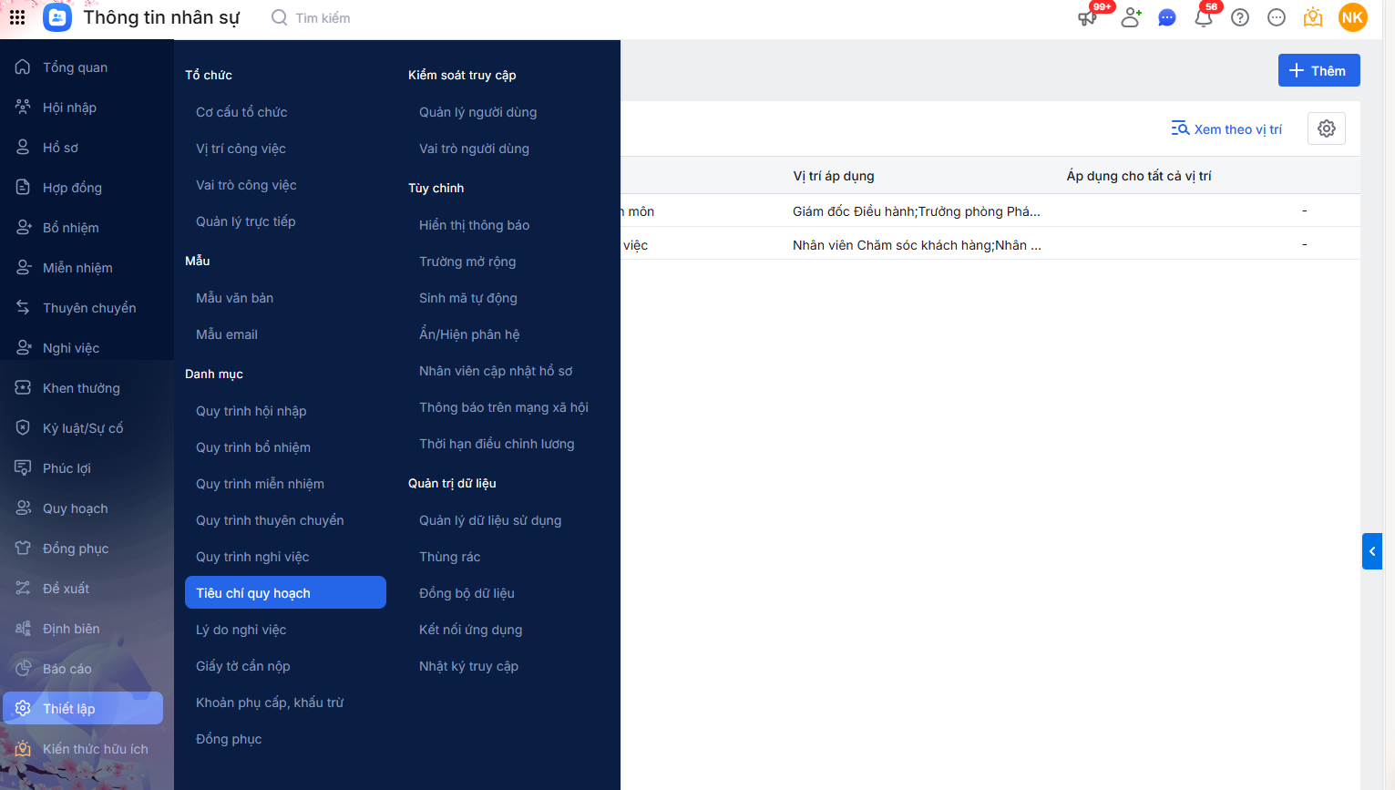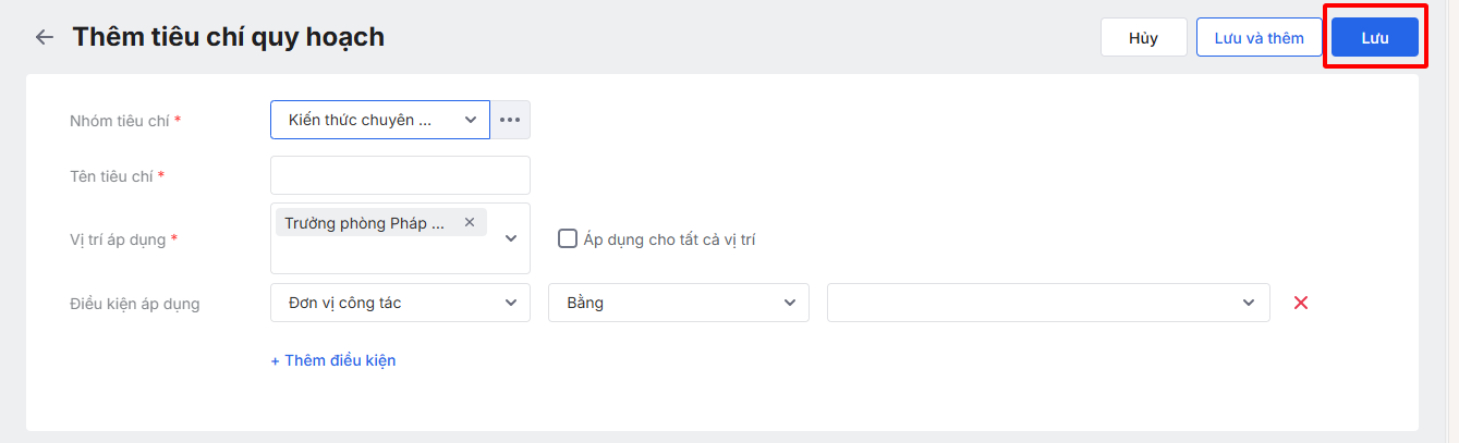 Nếu tiêu chí quy hoạch được áp dụng cho tất cả vị trí thì tích chọn “Áp dụng cho tất cả vị trí”. Còn nếu tiêu chí quy hoạch được áp dụng riêng cho một số vị trí công việc nhất định thì lựa chọn vị trí tương ứng.