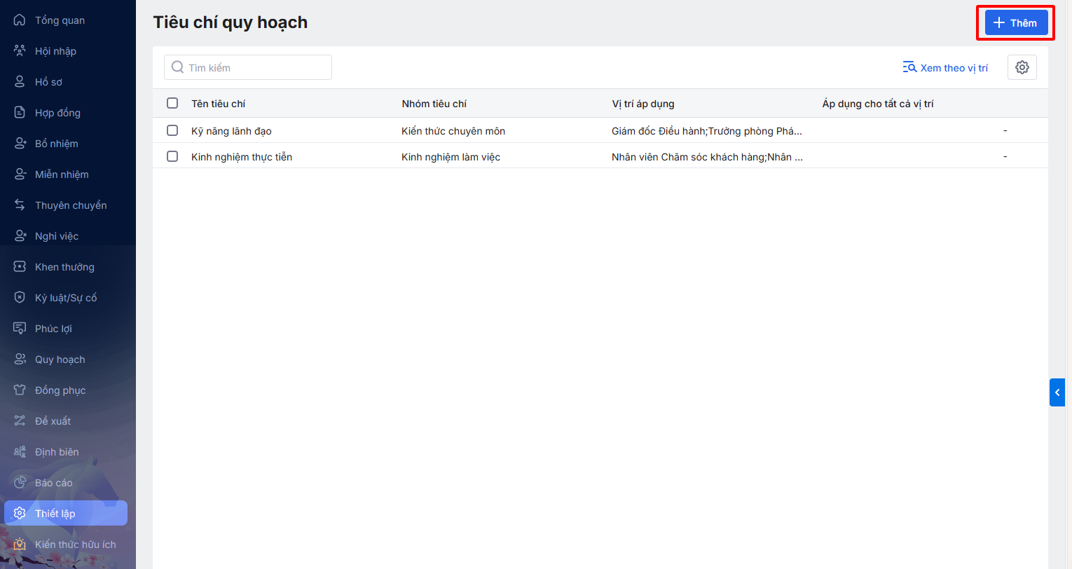 Bước 2: Nhấn Thêm để khai báo tiêu chí quy hoạch mới.