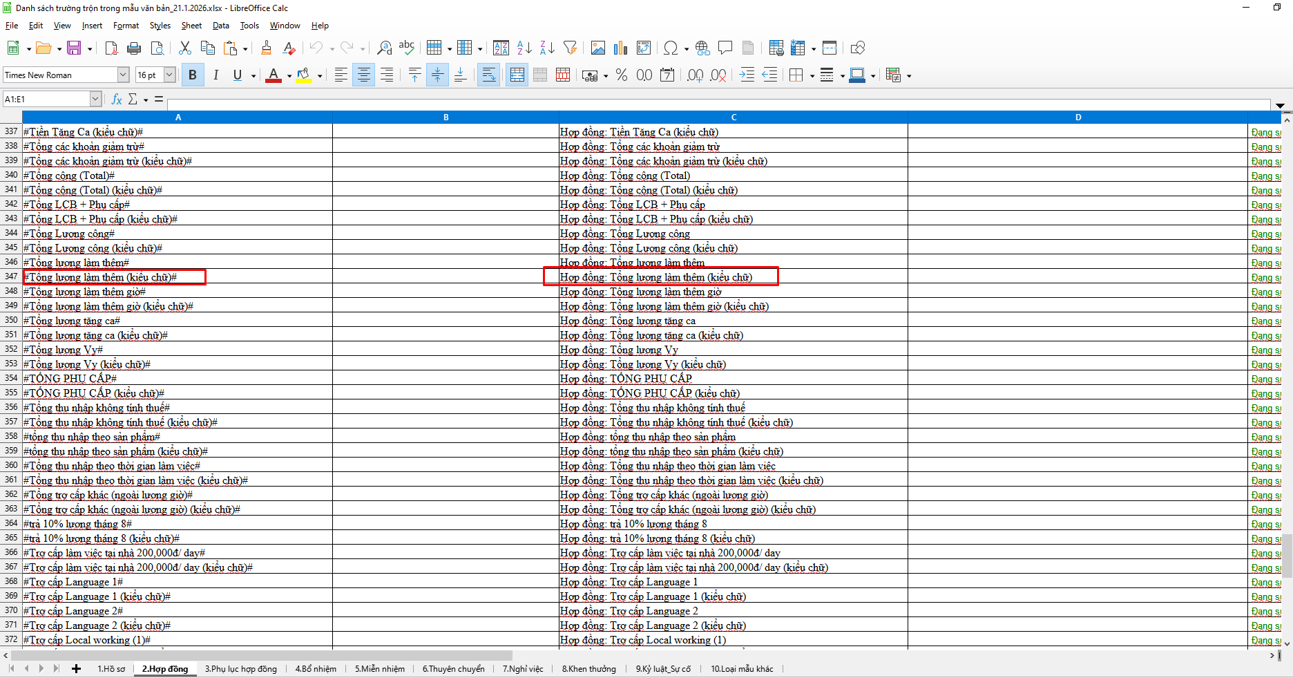 Khi tải file trường trộn về máy đối với các trường thông tin mặc định hoặc mở rộng tự thêm mà tính chất là tiền tệ có trên các phân hệ Hợp đồng, Hồ sơ, Nghỉ việc, Thuyên chuyển, Bổ nhiệm, … trên file trường trộn đã kèm theo trường trộn kiểu chữ để người dùng sử dụng trộn vào mẫu văn bản như Tiền lương tăng ca (kiểu chữ), Tiền lương cơ bản (kiểu chữ), … trên phần mềm.