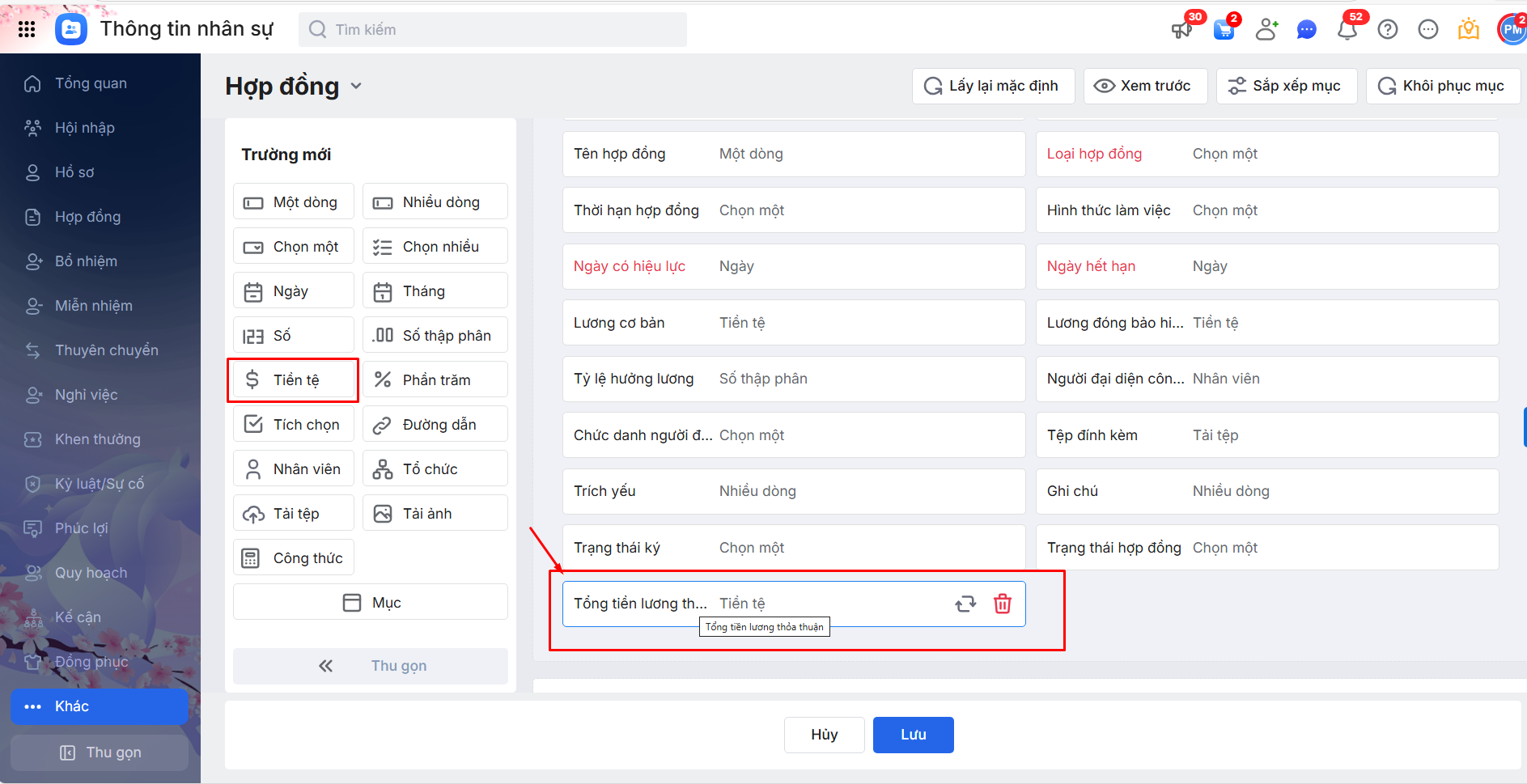 Lưu ý: Trong trường hợp khi tạo mẫu văn bản trên excel người dùng đang có các trường thông tin tự đặt công thức thì sẽ chưa có trường trộn kiểu chữ hỗ trợ. Người dùng có thể truy cập thiết lập thêm Trường mở rộng trên phần mềm và chọn trường tính chất tiền tệ đưa vào bố cục thì khi tải file trường trộn sẽ có sẵn trường trộn kiểu chữ đi kèm.
