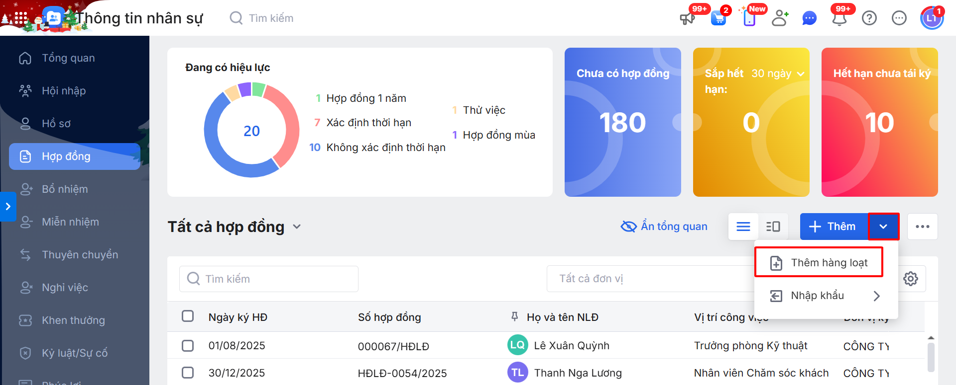 Nội dung bao gồm thao tác thực hiện từ danh sách nhân viên sắp hết hạn hợp đồng và sử dụng tính năng thêm hàng loạt.